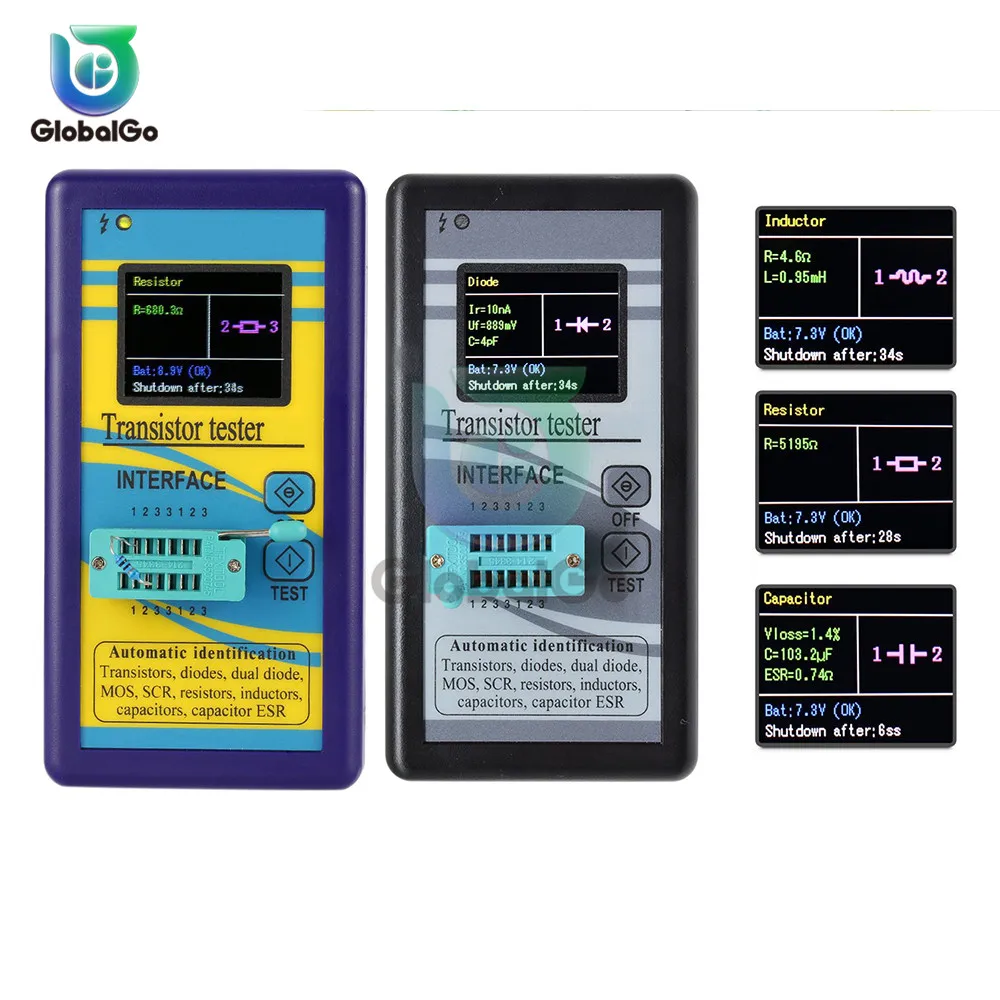 2: автоматическое обнаружение биполярных транзисторов PNP и NPN, N-канального и P-канального полевого МОП-транзистора, полевых трубок JFET, диодов, двойных диодов, SCR, сопротивления, емкости, индуктивности. Определение контакта автоматического обнаружения