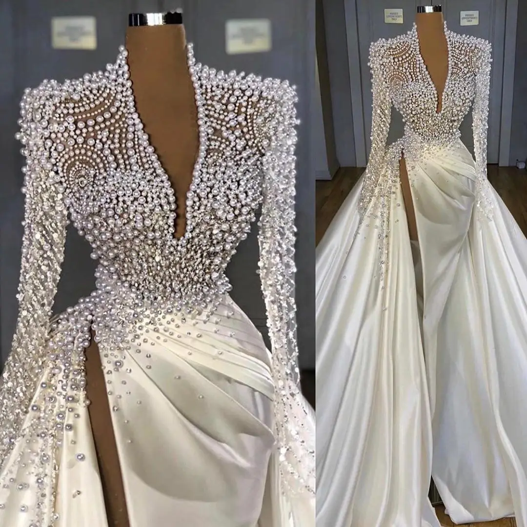 Свадебное платье-русалка, с жемчугом, с разрезом сбоку, глубоким V-...
