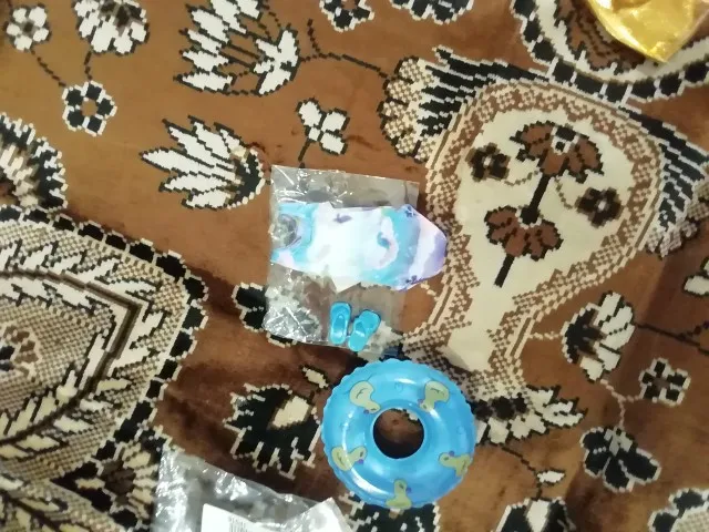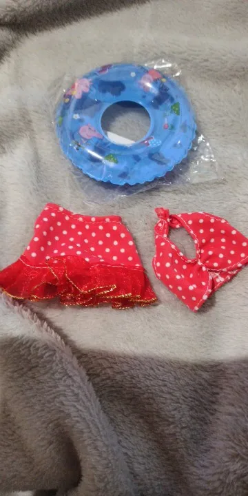 Комплект хороший, но нуждается в доработке, надеть его можно, только сняв кукле голову. Я этого делать не стала, чтобы не расшатывать якорь. Круг приходит уже надутый, для фото его не нашла сейчас, последние два фото с ним - маленький. Тапки резиновые, на любую ножку