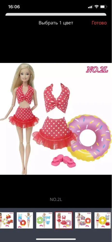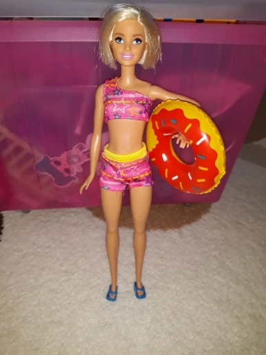 Отличный купальник! На Барби йогу хорошо сел. Сшит аккуратно. Круг и шлёпанцы пришли синие. Круг не сдувшийся, хороший, с изображением свинки Пеппы (заказывала ещё один у другого продавца, пришёл уже сдутый и никак не надуть его)