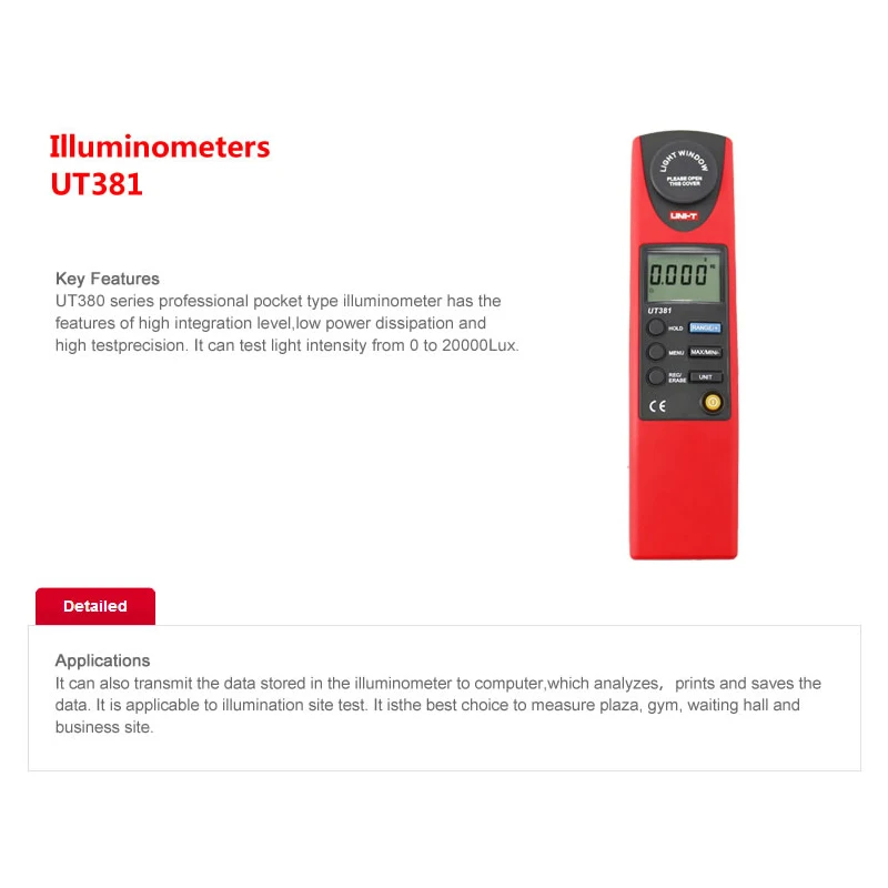UT383/UT383BT может эффективно измерять светильник интенсивности и результаты при измерении ёмкости отображаются в единиц Lux или FC на экране. UT383BT может передавать данные измерений через bluetooth в мобильное приложение UNI-T (iENV) для дальнейшего анализа, хранения и экспорта. IENV можно загрузить с сайта Google Play, Apple Store или UNI-T, отправив поиск «я».