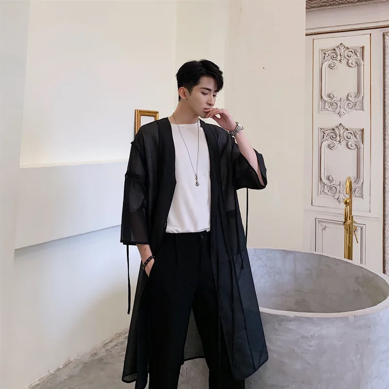 Тренч мужской прозрачный сетчатый, длинный кардиган в стиле хип-хоп, Японская уличная одежда в стиле панк, готика, одежда для сцены
