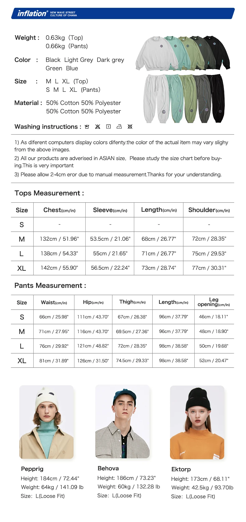 Я заказал оба предмета-джоггеры и свитер. Качество хорошее. Толстовка большого размера, брюки немного короткие. Я не такой высокий (164 см), и я получил размер M. Поэтому ваш выбор. В целом хороший комплект для вечерней летней прогулки, и это была причина, по которой я его купил.