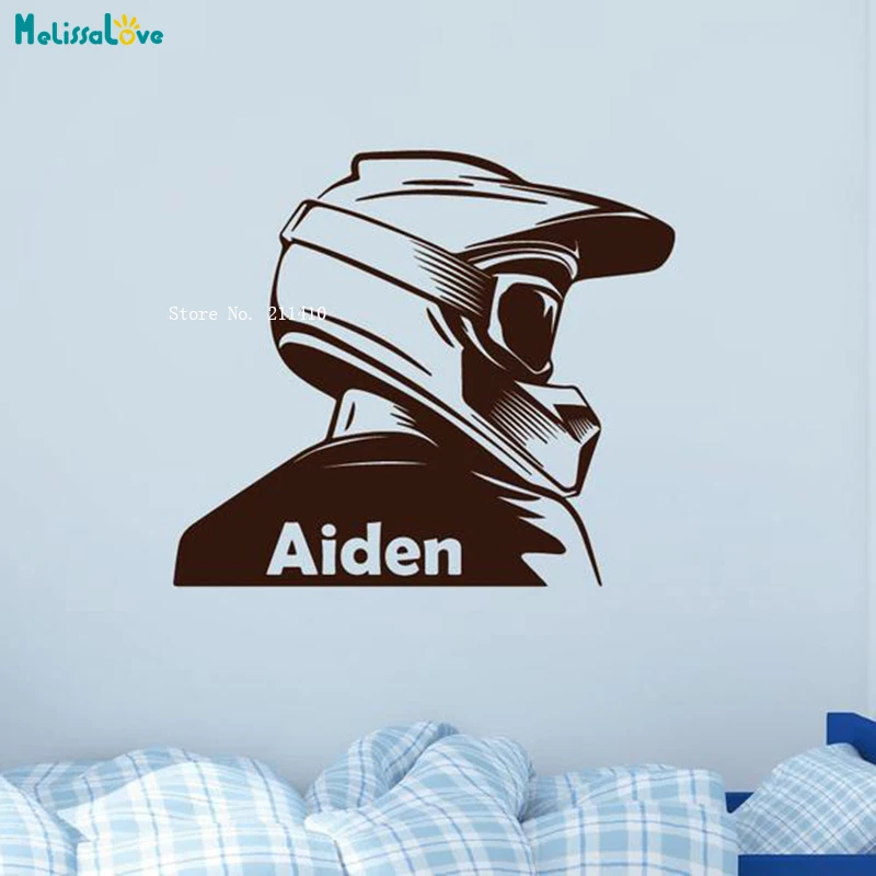 Персонализированные наклейки на стену для мотоцикла, мотокросса, для мальчиков, спальни, Декор, шлем, съемная виниловая наклейка с именем YT4907
