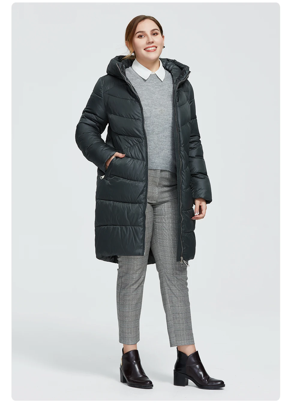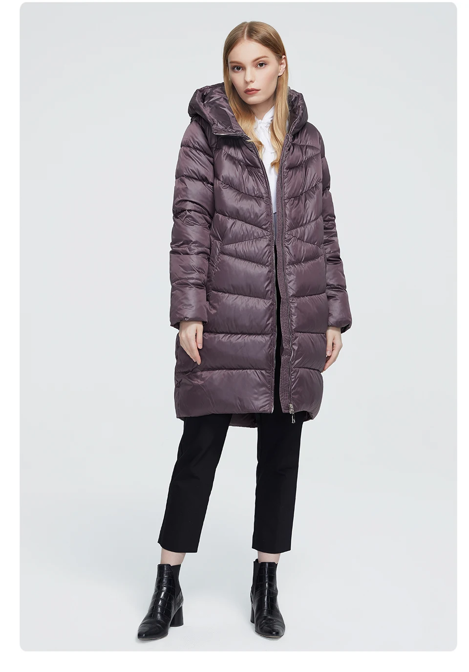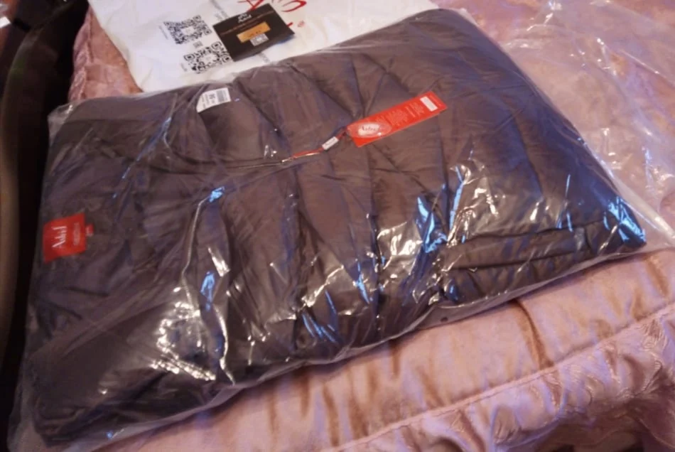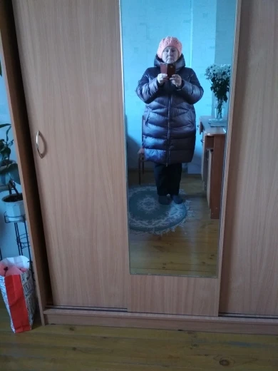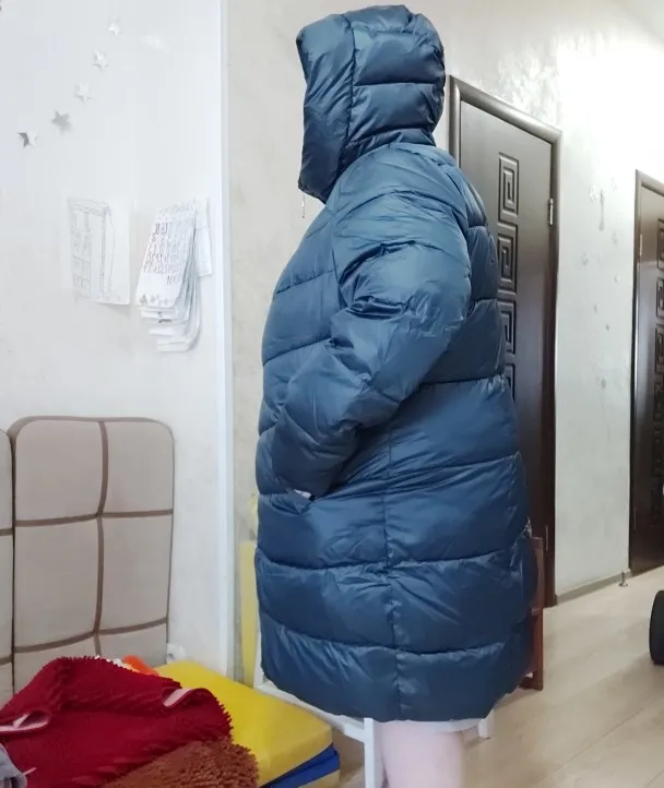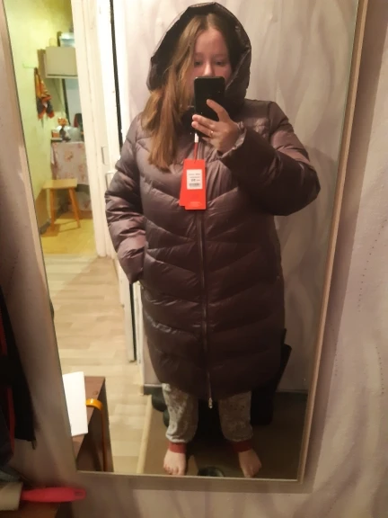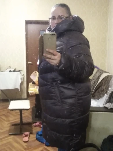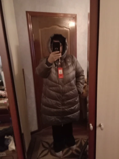 Пуховик хороший, но 9 хл немного большеват на 60-й русский размер, имейте в виду. Качество супер: нигде не помят, очень тёплый, легкий, отделка классная, не пахнет. Короче, как из магазина, только в 2,5-3 рада дешевле. Но вот можешь для полных не очень: она не заужается к низу и от того полнит.