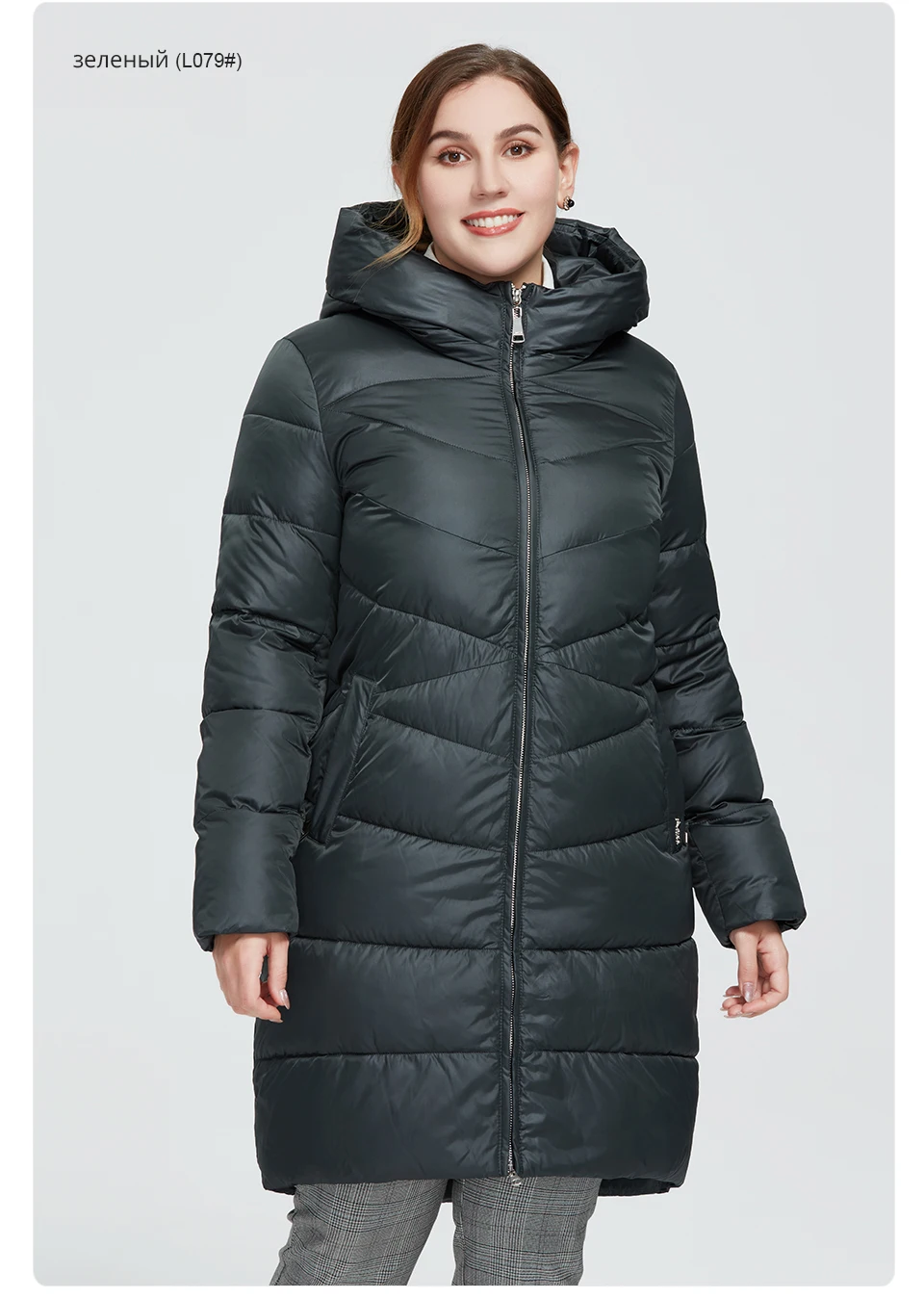 Куртка тёплая - 15с и сильный ветер выдержала хорошо, цвет как на фото, камера его не передает. Рост 163 ниже колен, на Объемы 120-110-150 выбирала по бёдрами, ничего не прибавляла, взяла 8xl(58) и в бёдрах свободно, покрой прямой. Рукава широкие на полную руку. Продавца рекомендую.