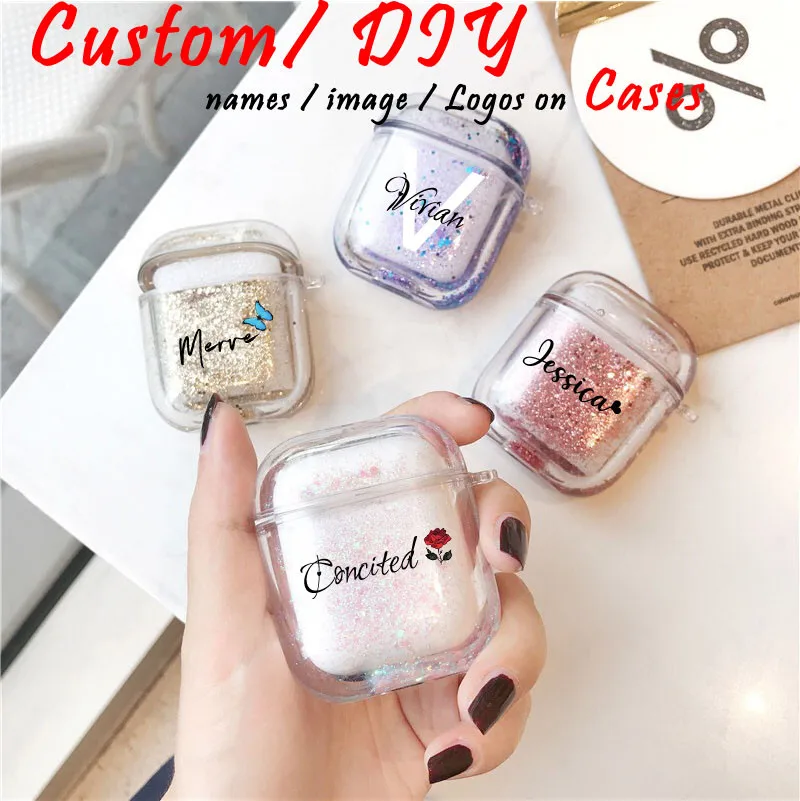 Чехол с индивидуальным логотипом имени для Airpods, блестящий чехол с жидким песком, милый Шикарный чехол Airpod, жесткий пластиковый чехол индивидуального дизайна