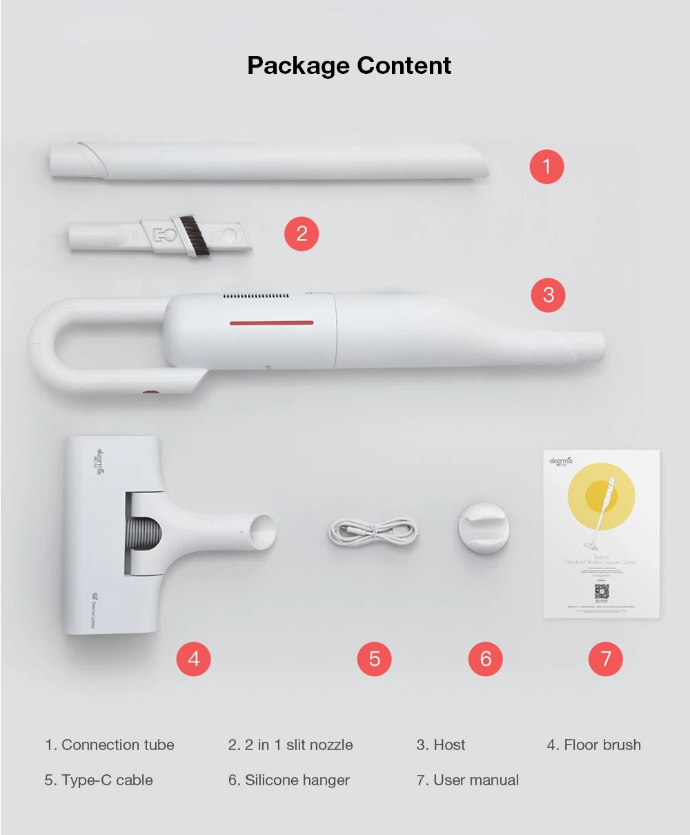1 хост, 1 соединительная трубка, 1 щелевая насадка 2 в 1, 1 щетка для пола, 1 кабель Type-C, 1 силиконовая вешалка, руководство пользователя на английском и китайском языках-1 шт.