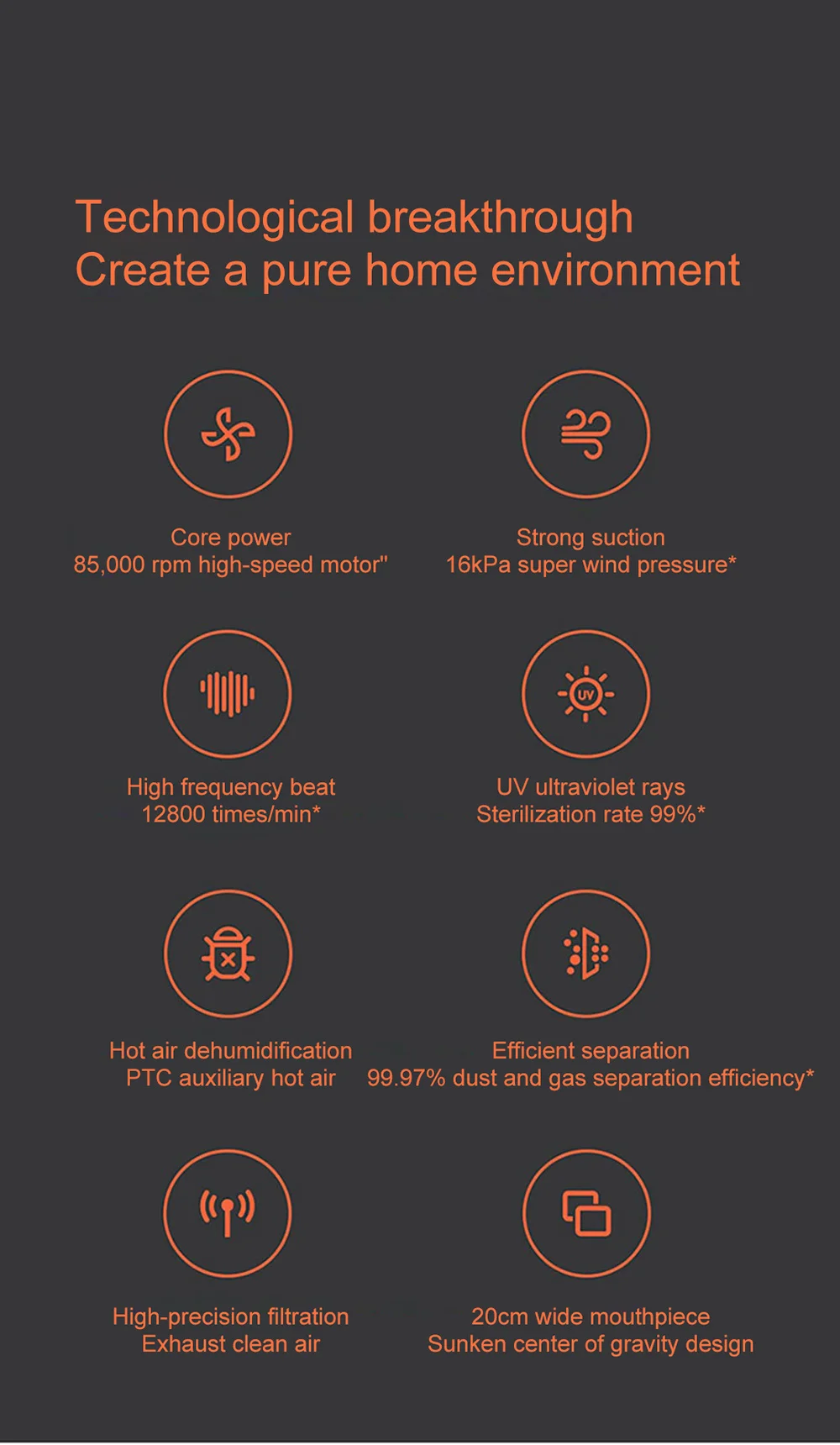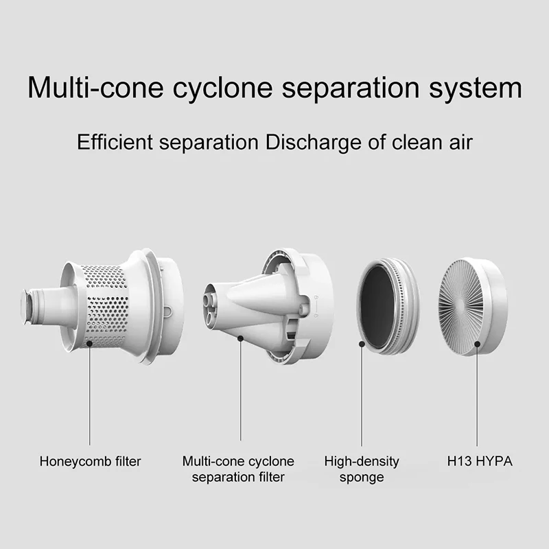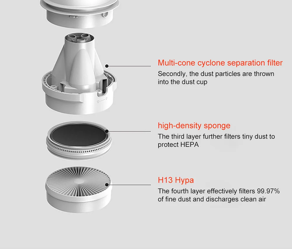 Mijia Wireless Mite Eliminator прорывается через ограничение объема и творчески имплантирует технологию разделения многоконусных циклонов для достижения четырехкратной фильтрации и поглощения до 99.97% пыли и аллергенов, избегайте вторичного загрязнения воздуха, И убедитесь, что мощность всасывания не ослаблена.