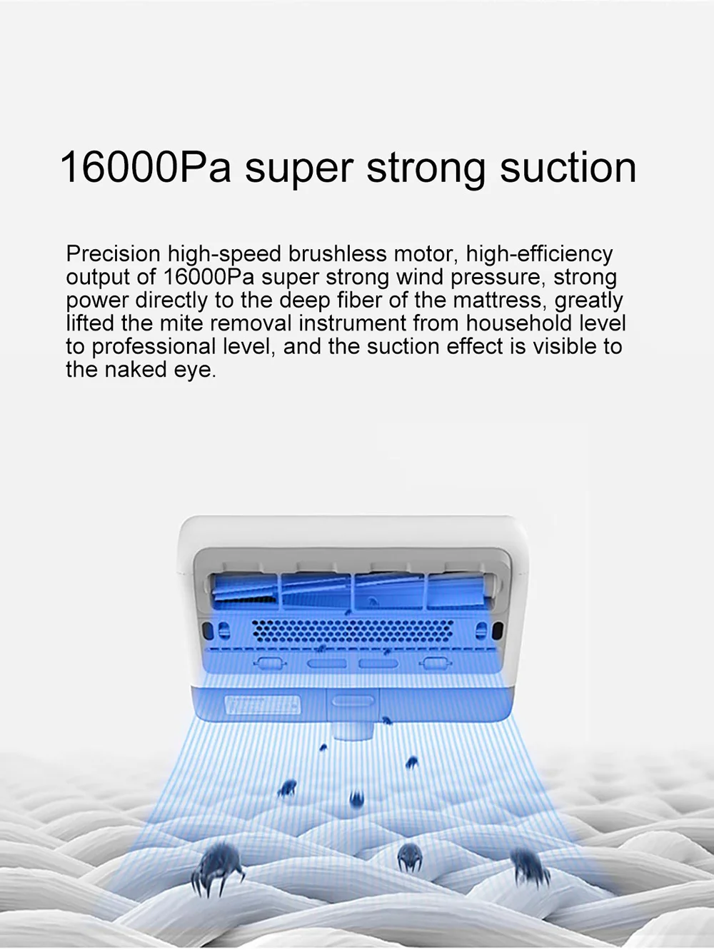 Прецизионный высокоскоростной бесщеточный двигатель, высокоэффективный выход 16000 ПА супер сильное давление ветра, сильная мощность непосредственно к глубокому волокну матраса, значительно продлевает срок службы инструмента для удаления клещей от домашнего уровня до профессионального уровня, и эффект всасывания виден невооруженным глазом.