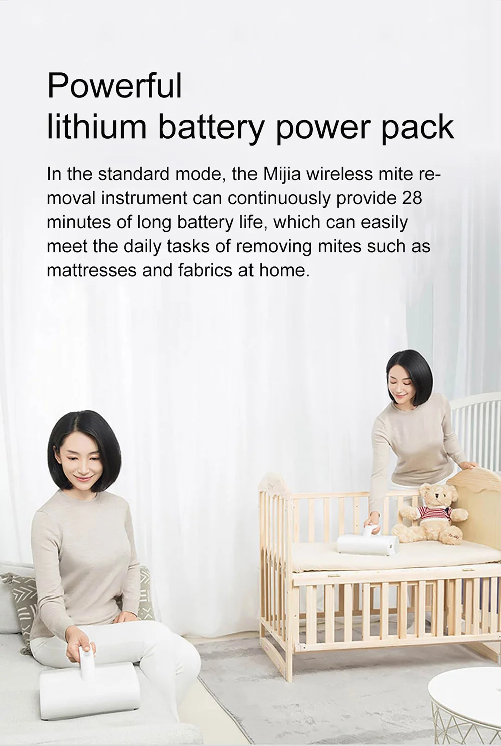 В стандартном режиме беспроводной прибор для удаления клещей Mijia может непрерывно обеспечивать 28 минут длительного срока службы батареи, что позволяет легко выполнять повседневные задачи по удалению клещей, таких как матрасы и ткани дома.