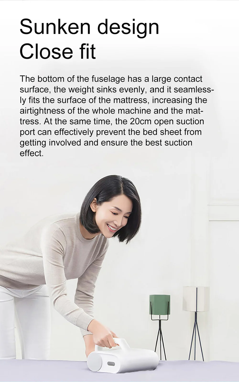 Дно фюзеляжа имеет большую контактную поверхность, вес равномерно, и он легко помещается на поверхность матраса, увеличивая герметичность всей машины и матраса. В то же время Открытый всасывающий порт 20 см может эффективно предотвратить вовлечение простыни и обеспечить лучший эффект всасывания.