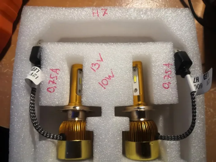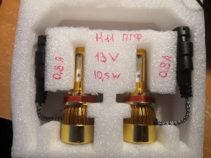 Лампы пришли за 3,5 недели в сборной посылке, по сравнению с штатными галогенками светят в 2-3 раза ярче (не в фаре, на столе) , свет приятный, чисто белый (6000К). Н7 Пробовал в старой снятой фаре, свето-теневая граница хорошая, но вроде чуть выше, чем от галогенок, но это можно легко исправляется корректором фар. Из за радиатора в фару ставить геморно (ЛАДА), под капотом вообще наверное будет Ж*ПА! Куллеры работают тихо, лампы практически не греются (в отличии от галогенок) из-за чего возможно фары будут обледеневать или запотевать... Н7- при 13В ток 0,75А (10w) (галогенка- 3,25А) (ближний), Н11- при 13В ток 0,8А (10,5w) (птф) Будем надеяться что будут работать долго. Так же заказал в ДХО и задний ход. Продавца и товар рекомендую, после установки и обкатки дополню отзыв.