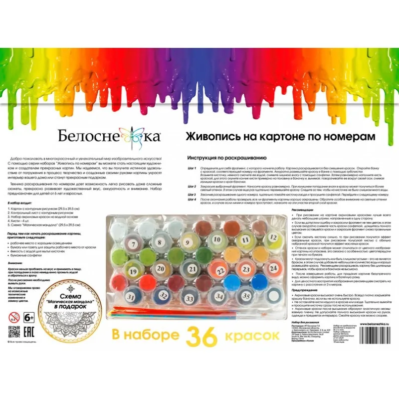 Цифровое рисование устроено предельно просто: на основу из картона приклеена белая бумага, на которую нанесен рисунок, разбитый на пронумерованные сектора. Живопись по номерам «Цифрорисовашка» комплектуется акриловыми красками на водной основе, которые не обладают резким и неприятным запахом, что, в первую очередь, гарантирует безопасность при использовании красок. С помощью них и вашей усидчивости результат непременно оправдает личные ожидания и заставит восхищаться любого.В наборах для творчества мы ориентируемся на достоверное воспроизведение оригинала, а это значит, что мы обеспечиваем использование авторских работ художников и качественную оцифровку изображения с мельчайшей детализацией.С приобретением картины по номерам на картоне "Цифрорисовашка" вы, несомненно, обретёте и долю спокойствия с частичкой счастья, а продукт творческого процесса станет отличным украшением для дома.Комплектация:1. Картон с контурным рисунком2. Контрольный лист со схемой3. Набор акриловых красок на водной основе – 36 цветов4. Кисти – 4 шт.5. Листовка о художнике6. Схема «Магическая мандала»Характеристики:Художник – Юлия НеприятельСерия – животныеРазмер - 30*40 см.Тип красок – акриловые быстросохнущиеКоличество цветов – 36Упаковка – конверт из плотного картонаТорговая марка – БелоснежкаСтрана производства - Китай