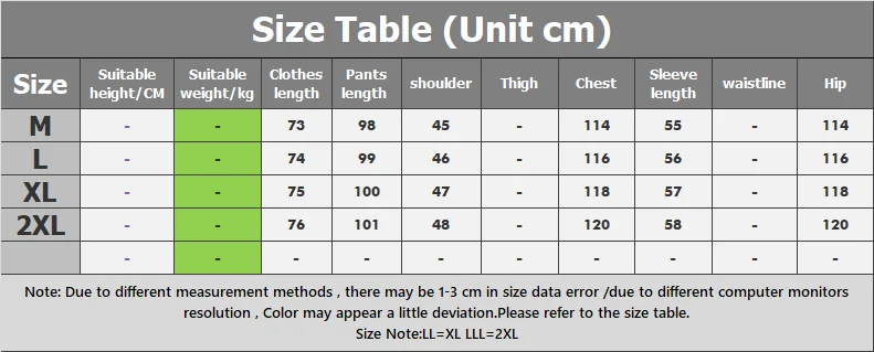 Таблица размеров (единица см)РазмерыПодходящая высота/смПодходящий вес/кгДлина одеждыДлина брюкПлечоБедраГрудьДлина рукаваЛиния талииБедраМ--739845-11455-114L--749946-11656-116XL--7510047-11857-1182XL--7610148-12058-120----------Примечание: Из-за различных методов измерения возможна погрешность в размере 1-3 см/из-за различий в разрешении компьютерных мониторов цвет может немного отличаться. Пожалуйста, обратитесь к таблице размеров.Примечание по размеру: LL = XL LLL = 2XL