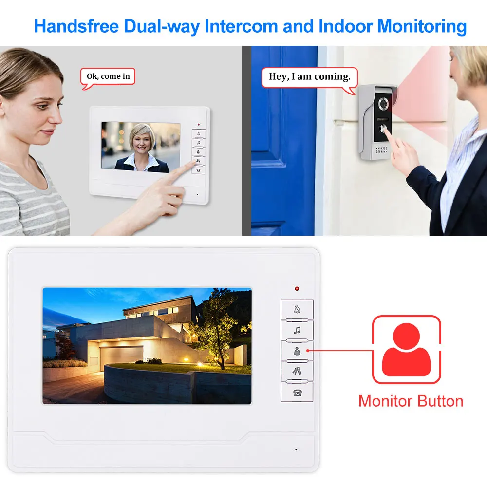 Эта система видеодомофона может работать с электрическим замком. Вы можете открыть дверь с помощью внутреннего монитора. Не нужно идти, чтобы открыть дверь для васПосетителю.Очень удобно!