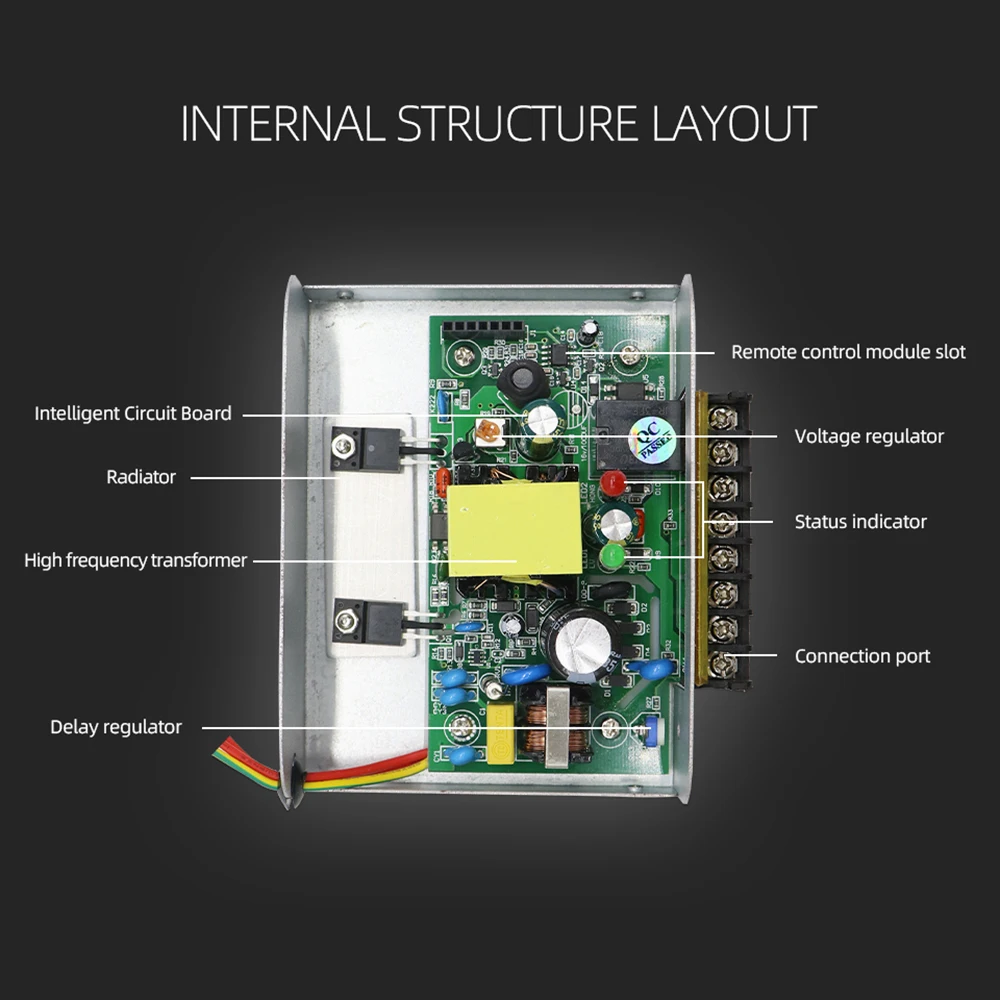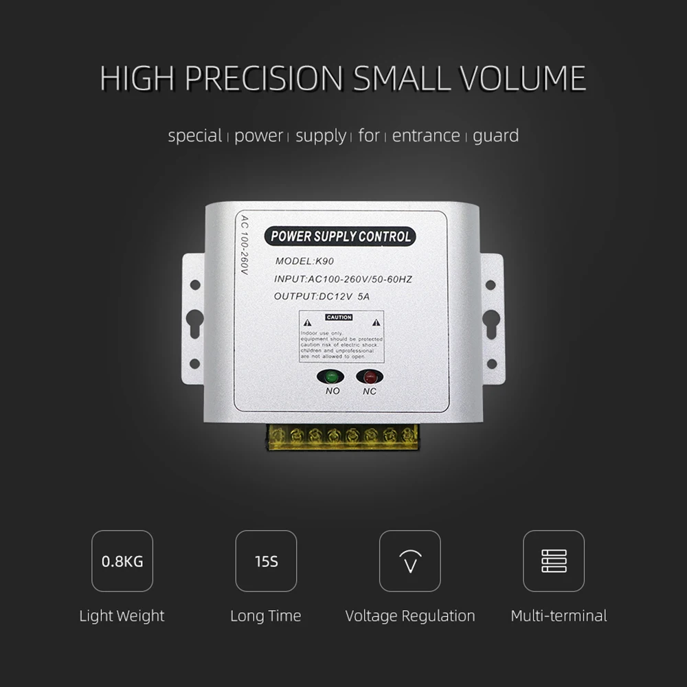 * Входное напряжение переменного тока 100-260 В, а частота 50-60 Гц * Высокое низкое давление, 1500VAC/1 минута не ломаются * Регулируемое выходное напряжение DC11.5V-13.5V (для расстояния проводки, чтобы замок не работал, тогда можно взять высокое напряжение) * Напряжение Пульсации выходного тока: 5А; upp = 50мв * Cotrol-это группа активных входных сигналов (DC5-24V) и внутренней изоляции, и может одновременно подключать несколько контроллеров управления доступом и домофон зданий