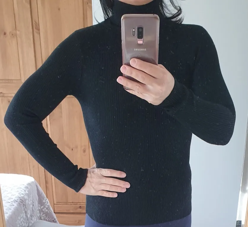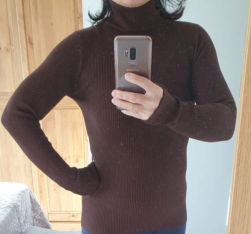 Гольфик лучше подойдёт на размер XS, невысокую девушку. Для моего роста 165 см рукава сильно короткие, как 3/4. Цвет красивый, ткань со временем менее приятная к телу. Доставка хорошая, около 3-х недель.