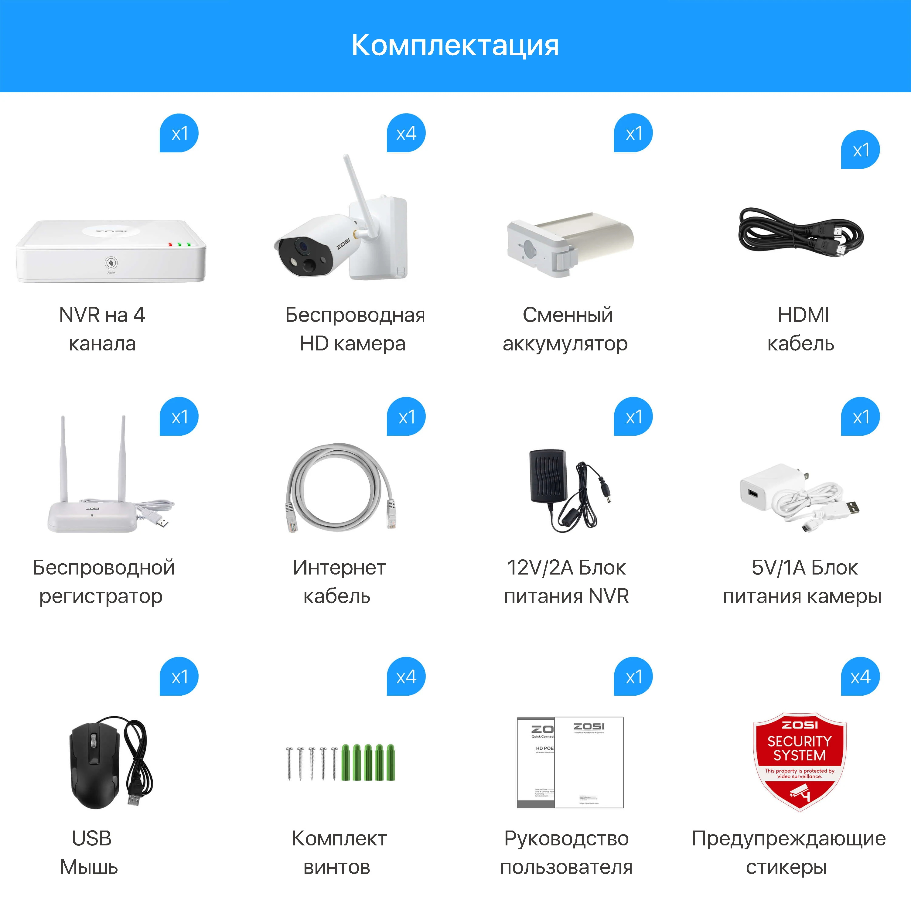 Беспроводной комплект ZOSI C301 с четырьмя беспроводными камерами видеонаблюдения c ночным видением до 25м, встроенным динамиком и микрофоном для двустороннего аудио и слотом для карты памяти или жесткого диска.