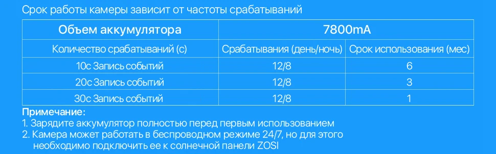 Камера C301 оснащена перезаряжаемой батареей емкостью 7800mA, которая предназначена для низкого энергопотребления и длительного использования. Камера просыпается только при обнаружении движения, что значительно увеличивает срок службы батареи. Камера работает до 6 месяцев без подзаряда (15 раз срабатываний/день). Когда батарея разрядится, просто извлеките ее и зарядите.