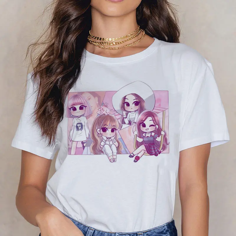 Новая женская футболка в стиле Харадзюку с изображением героев мультфильмов, черная, розовая футболка Kawhi, одежда с розой Дженни, летняя модная Милая футболка для девушек