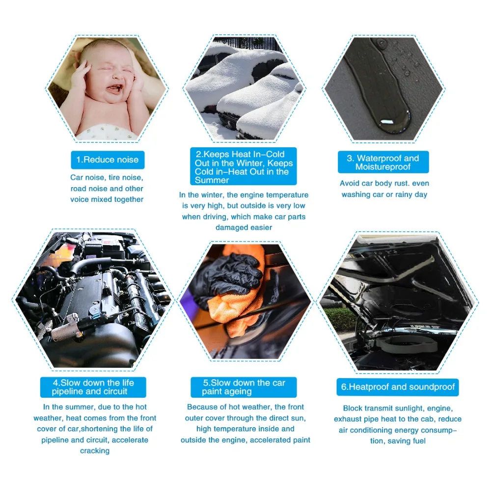 Сохраняет тепло в мороз зима, держит холод-тепло в летнее время. Зимой температура двигателя очень высокая, но снаружи очень низкая во время вождения, что облегчает повреждение автозапчастей