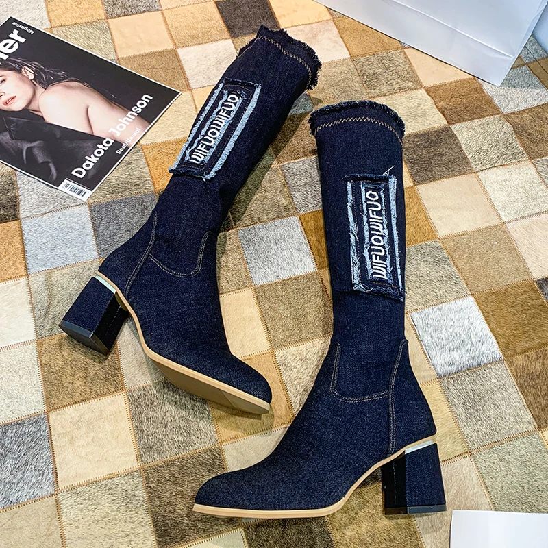 Женские эластичные джинсовые сапоги Lucyever, винтажные высокие сапоги без застежки на толстом высоком каблуке, повседневная обувь с кисточками, 41, 2020