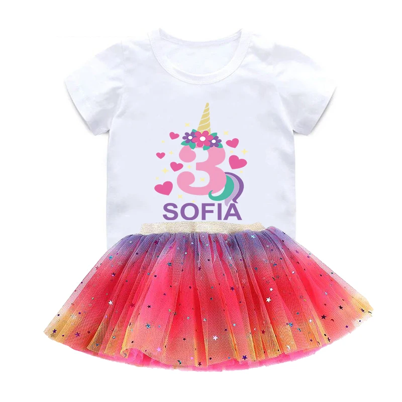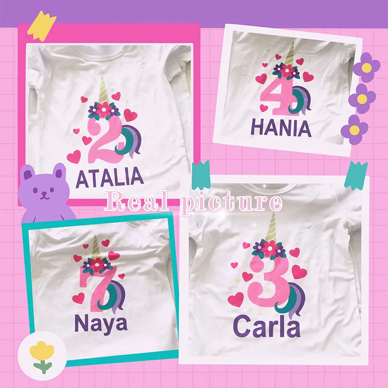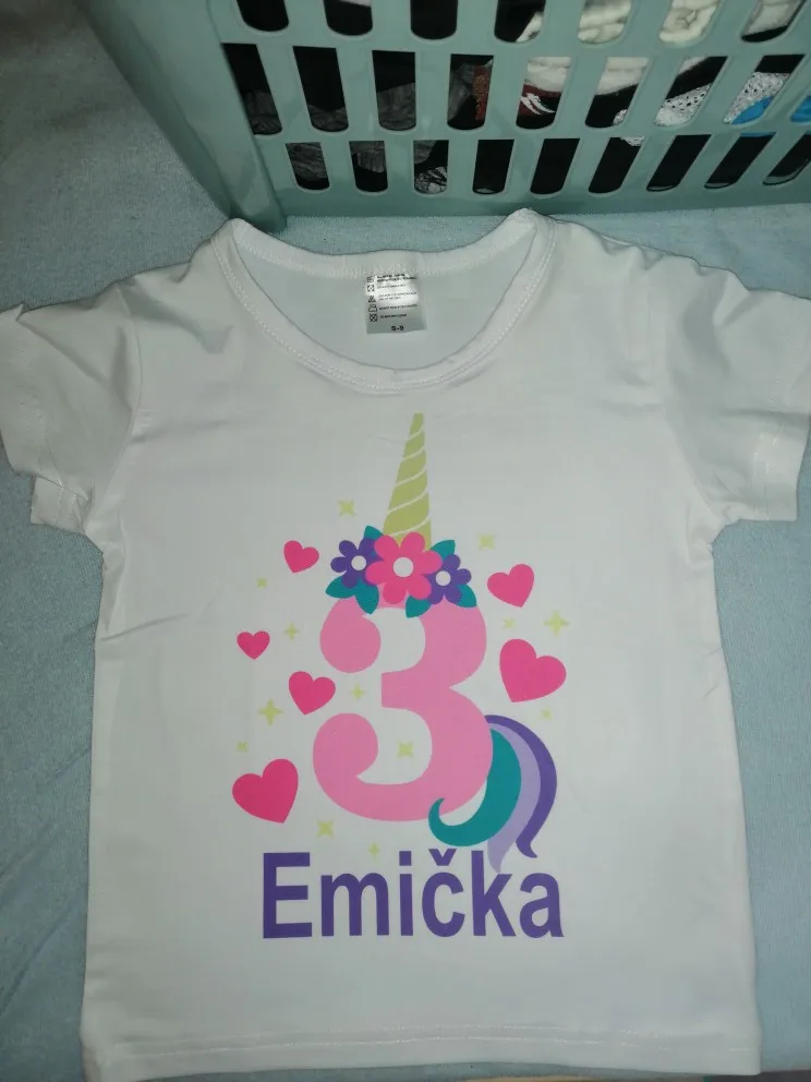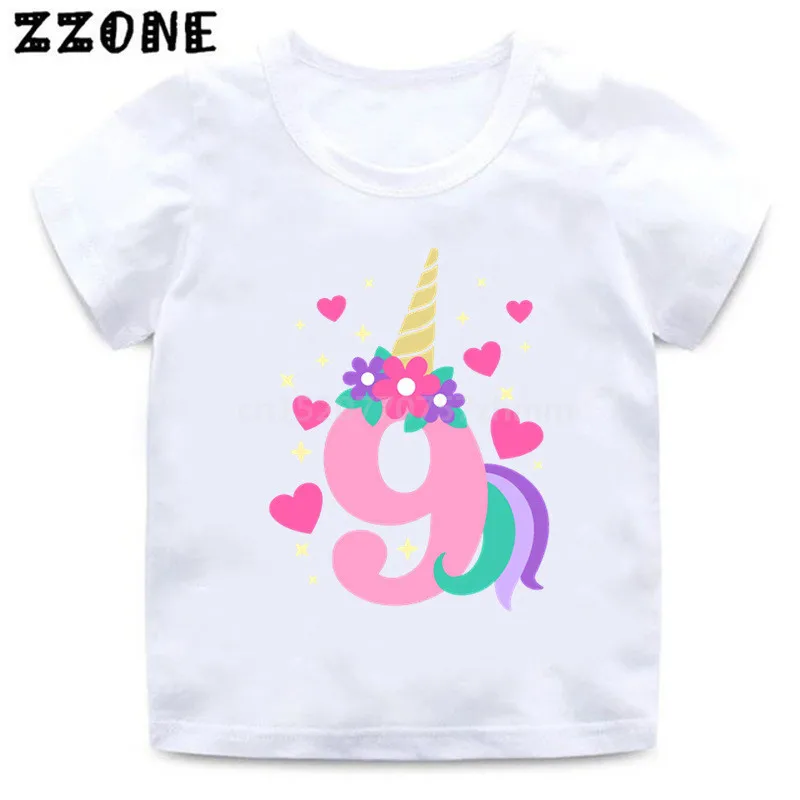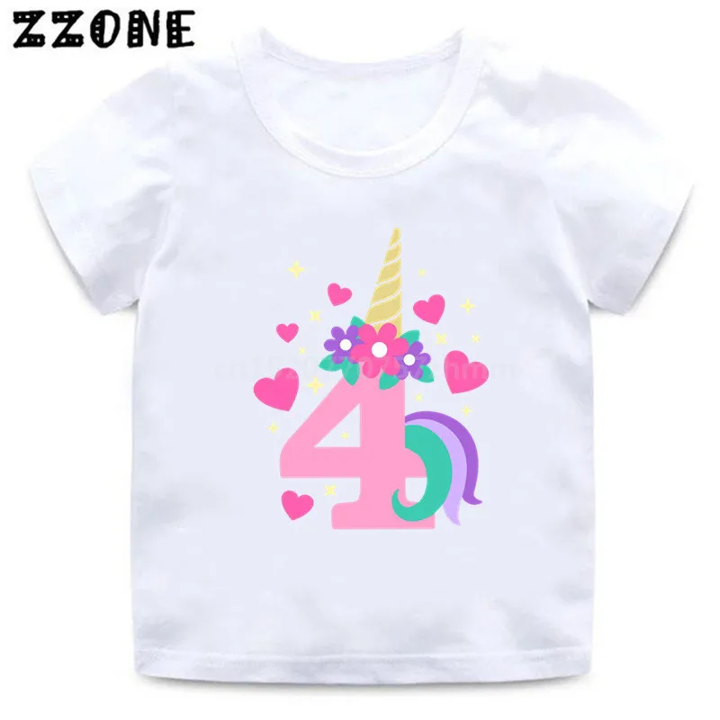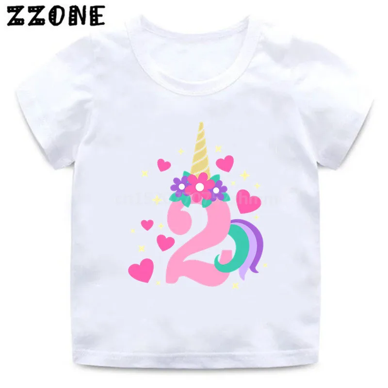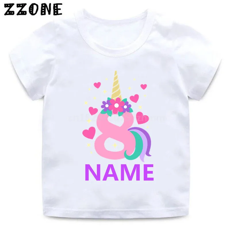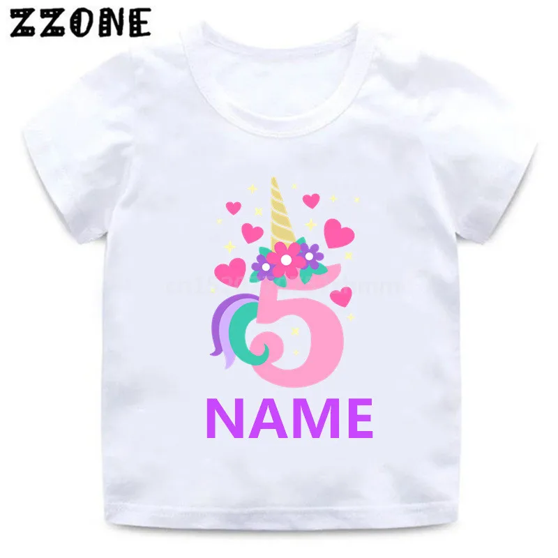 Футболка на день рождения с именем на заказ Милая футболка с рисунком единорога для девочек от 1 до 10 лет летние детские топы, Забавная детская одежда HKP5399