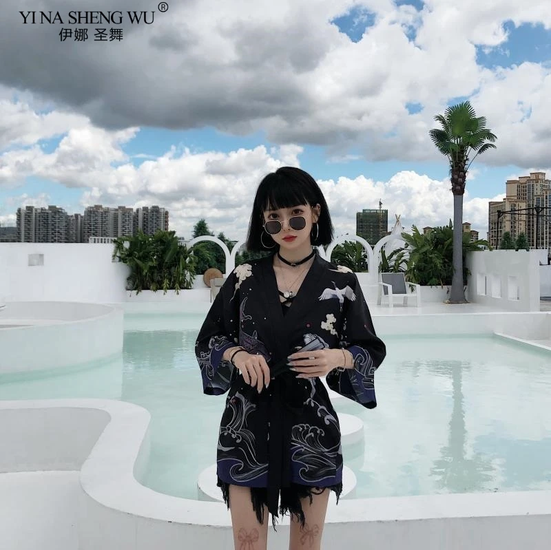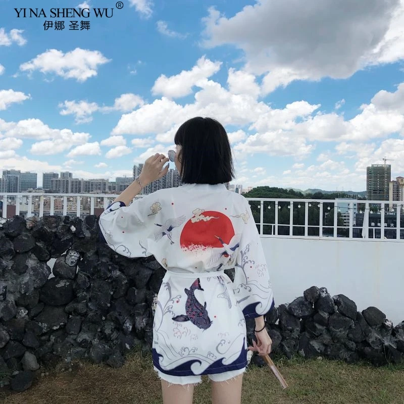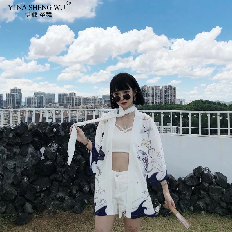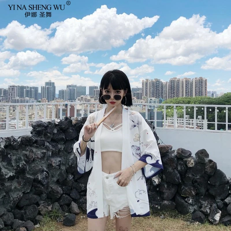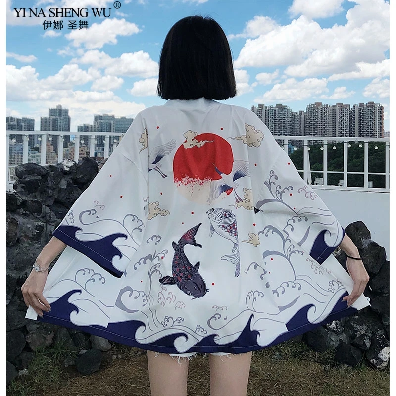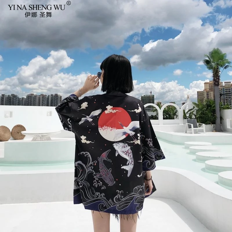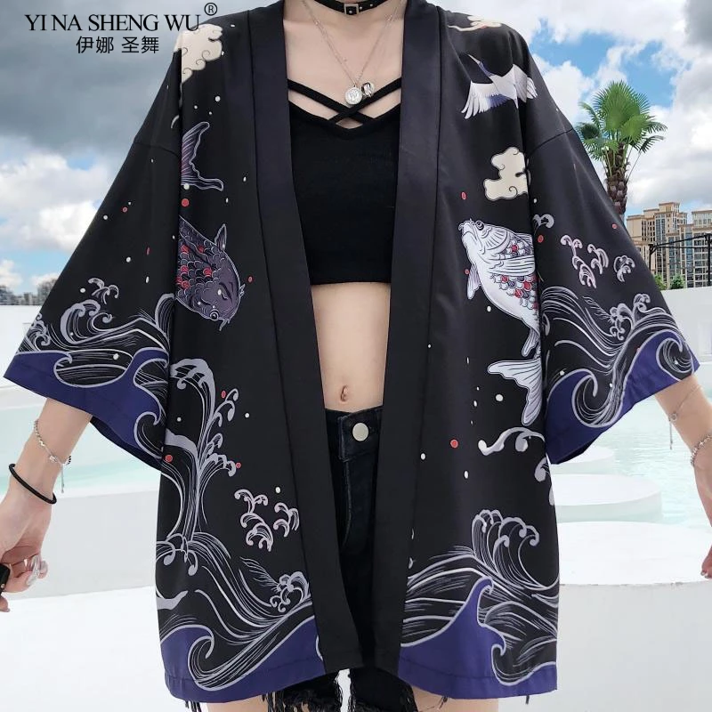 Кимоно женское с принтом рыбы, традиционный кардиган в стиле Харадзюку, юката, уличная одежда с Оби, хаори, Пляжное пальто, в японском стиле