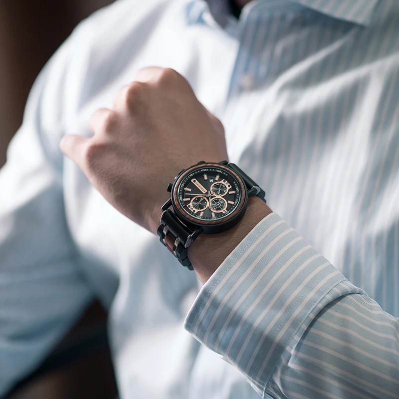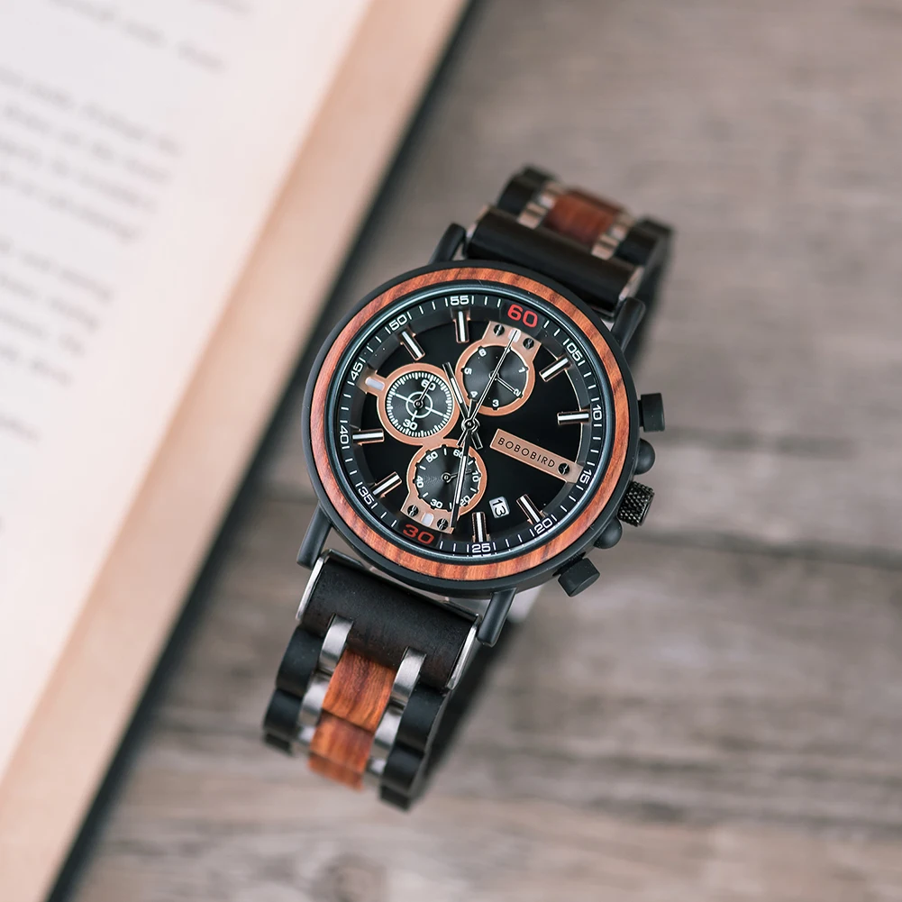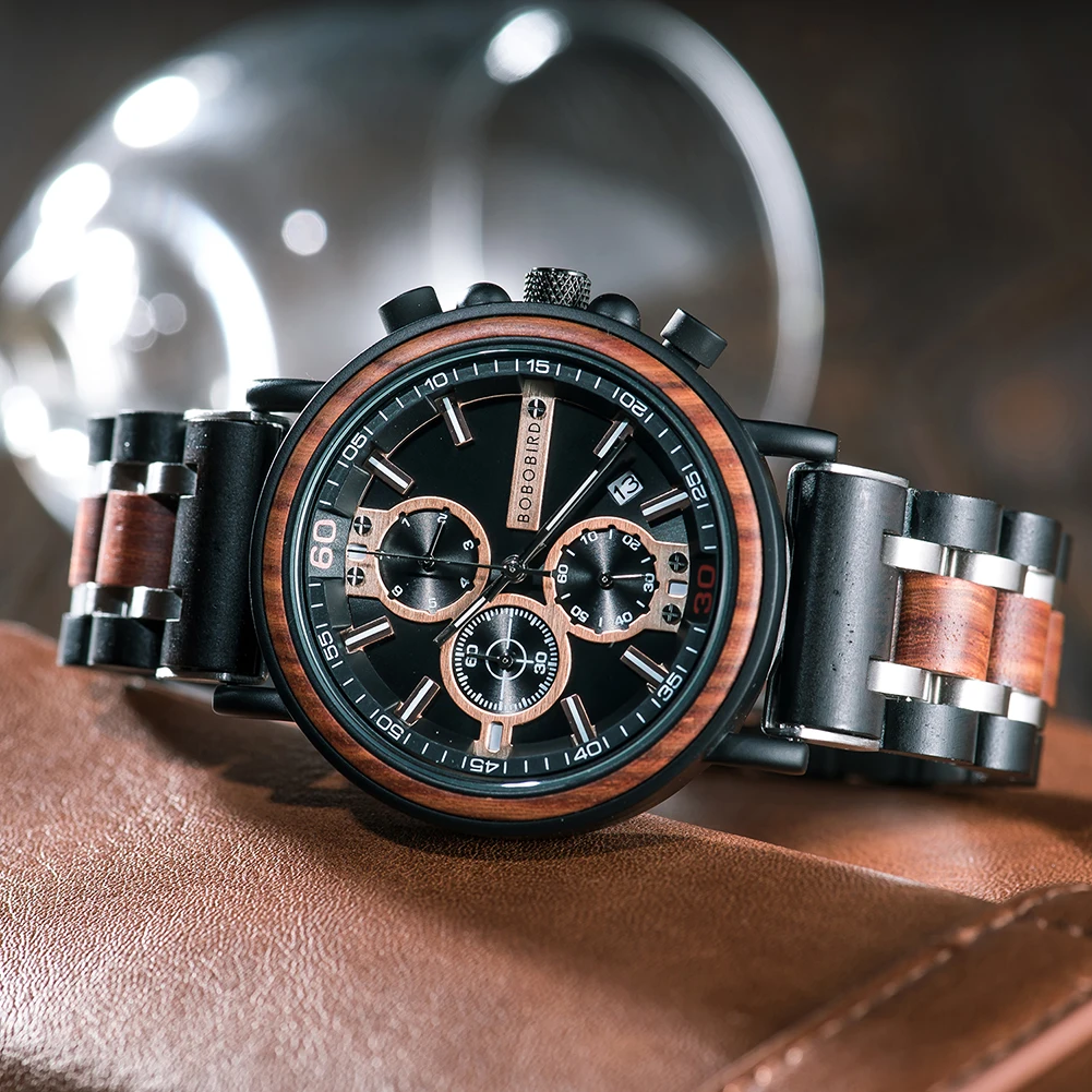 Часы наручные мужские деревянные с хронографом, брендовые роскошные, подарок для Него в деревянной коробке