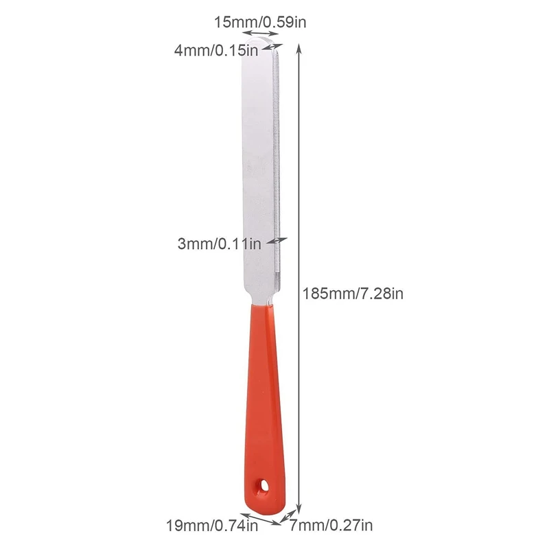 Напильник Luthier для Коронования гитарных ладов: изготовлен из нержавеющей стали, с поверхностью для подачи опилок длиной 10 см и эргономичной резиновой ручкой для удобного удержания.