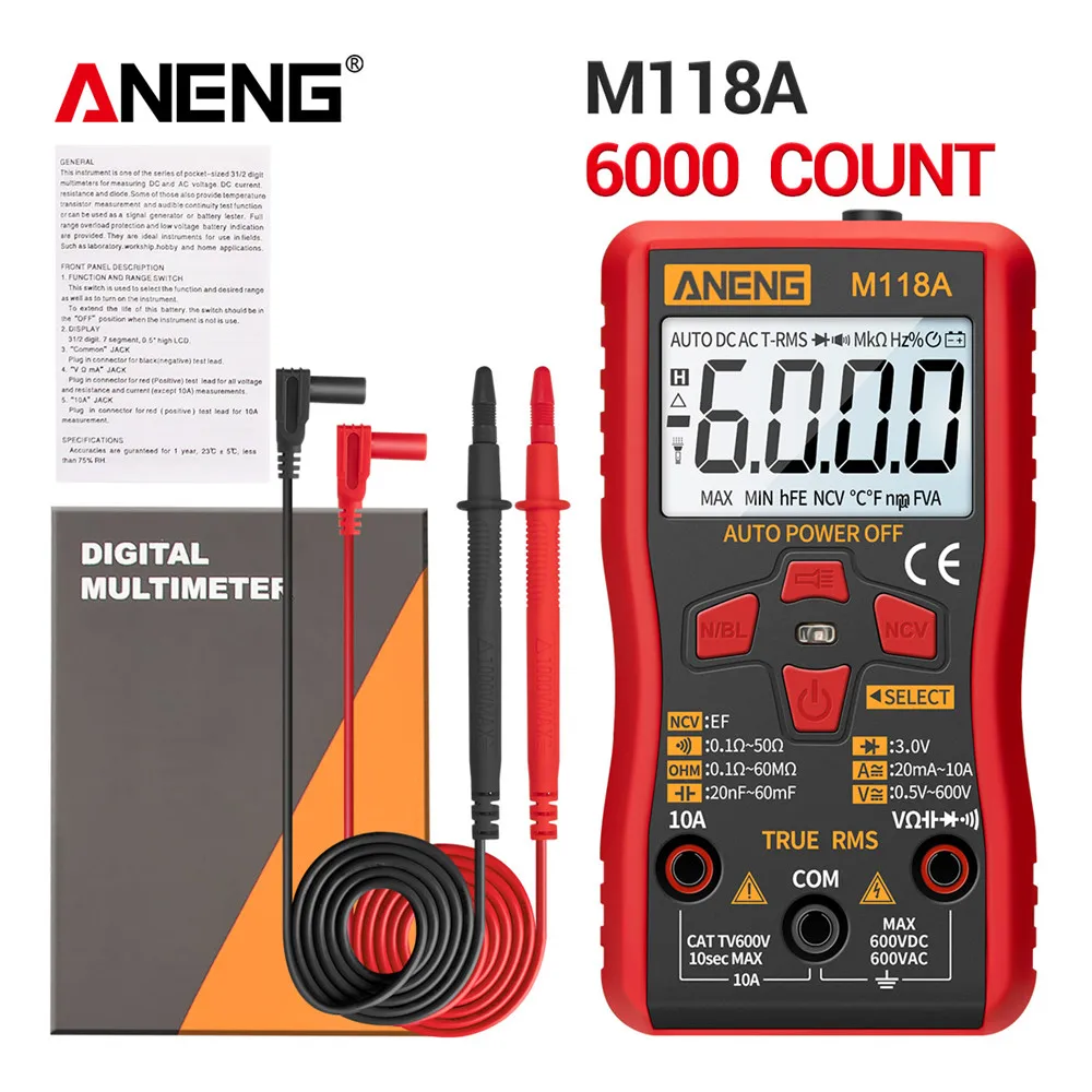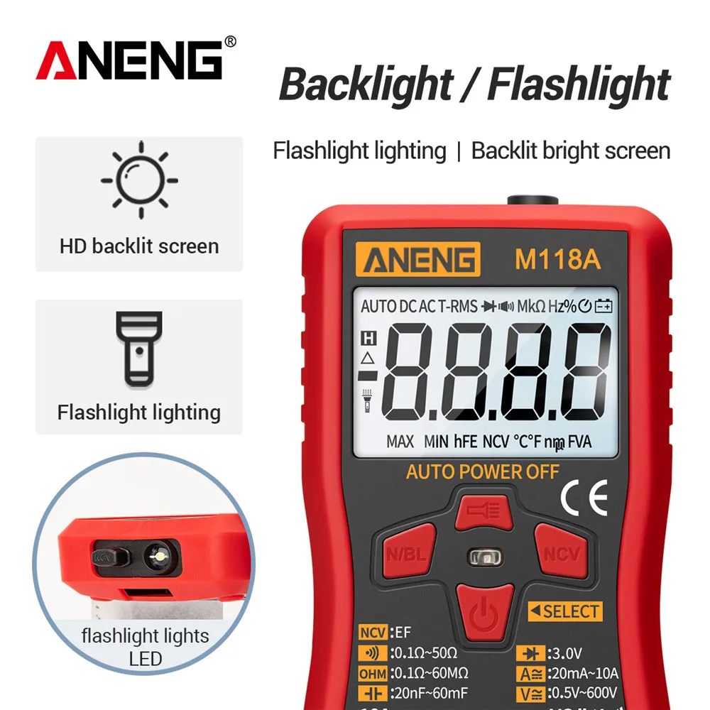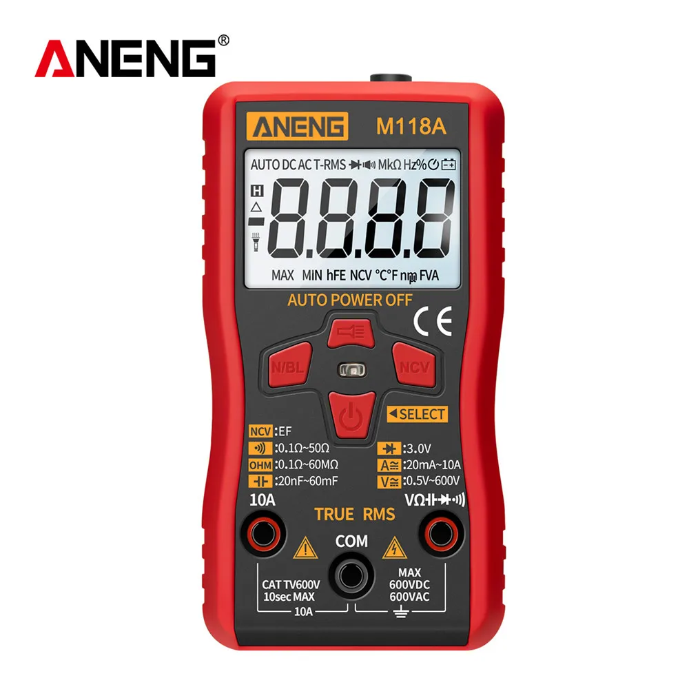 Цифровой мини-мультиметр, тестер ANENG M118A, автоматический мультиметр, транзистор с True Rms и счетчиком бесконтактных данных, 6000 отсчетов, фонарик