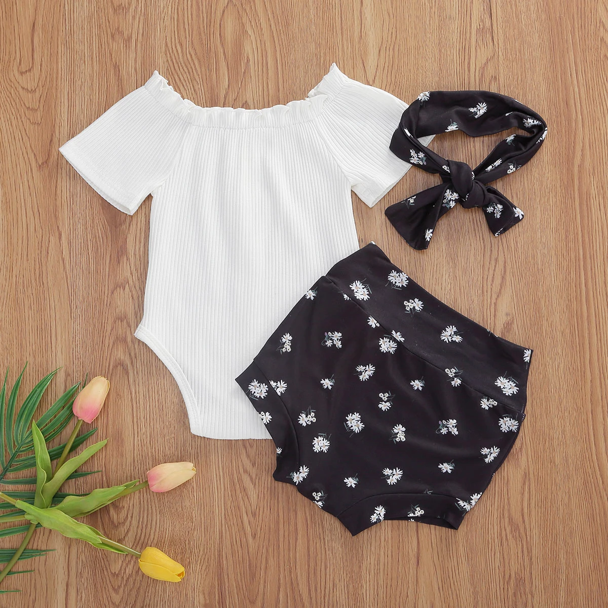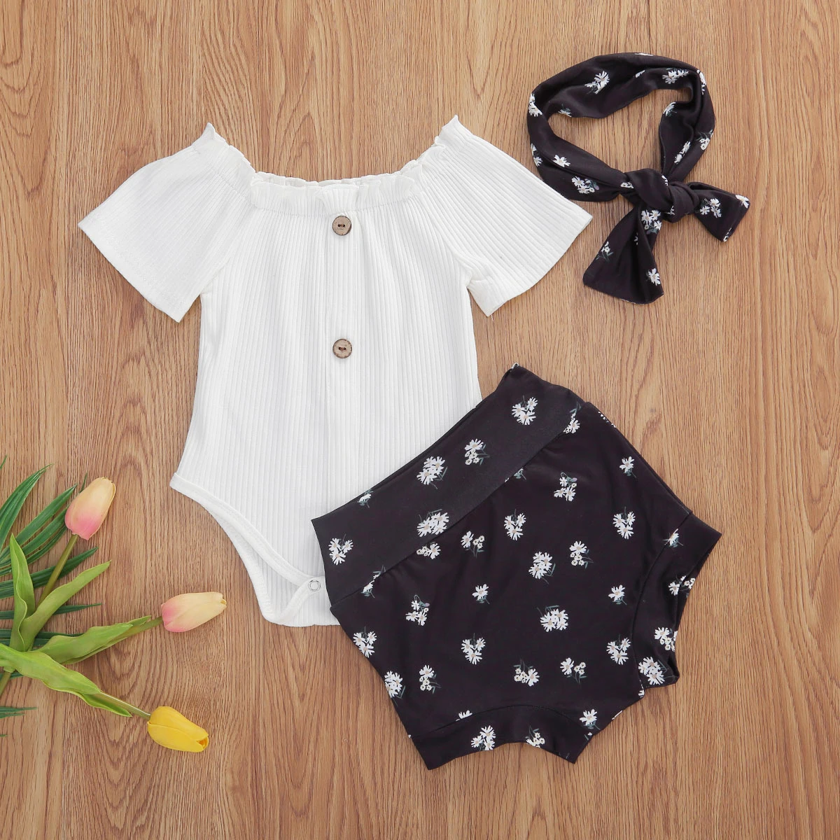 Комбинезон Pudcoco, 3 шт., для девочек, с открытыми плечами, короткими рукавами, на пуговицах, с цветочным принтом