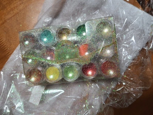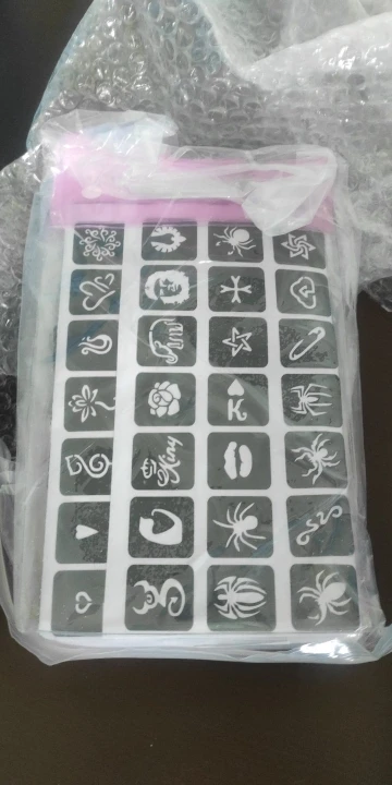 Клейн весь засохший, две баночки блесток рассыпали при перевозки видимо. Трафареты некоторые прилипли к другой странице.