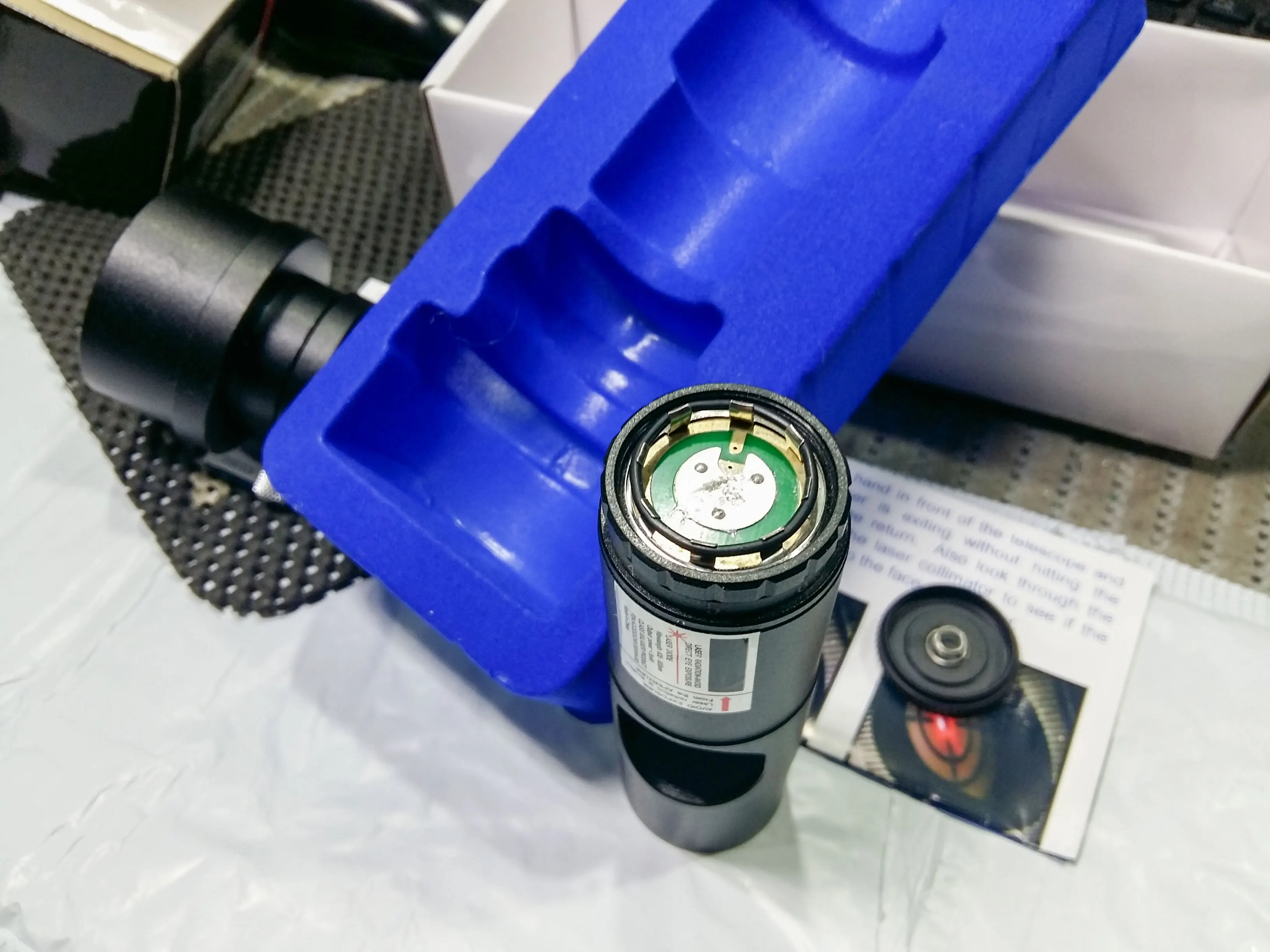 Будьте внимательны, это не очень точный колиматор. На самом деле лазер не является 100% цветным и точка движется вокруг, когда вращается на 360 ° внутри окуляра рецептора.