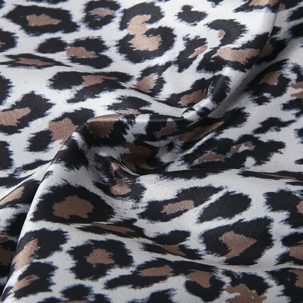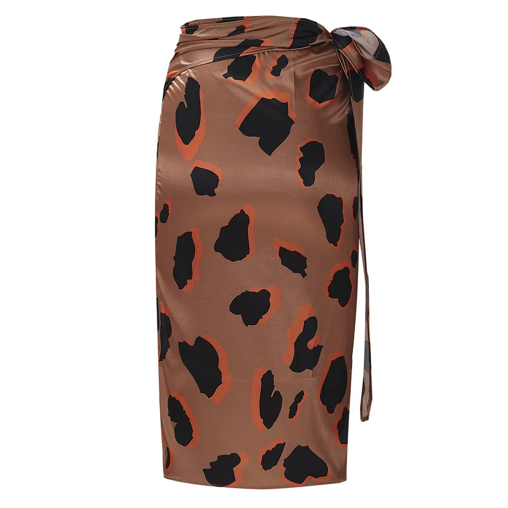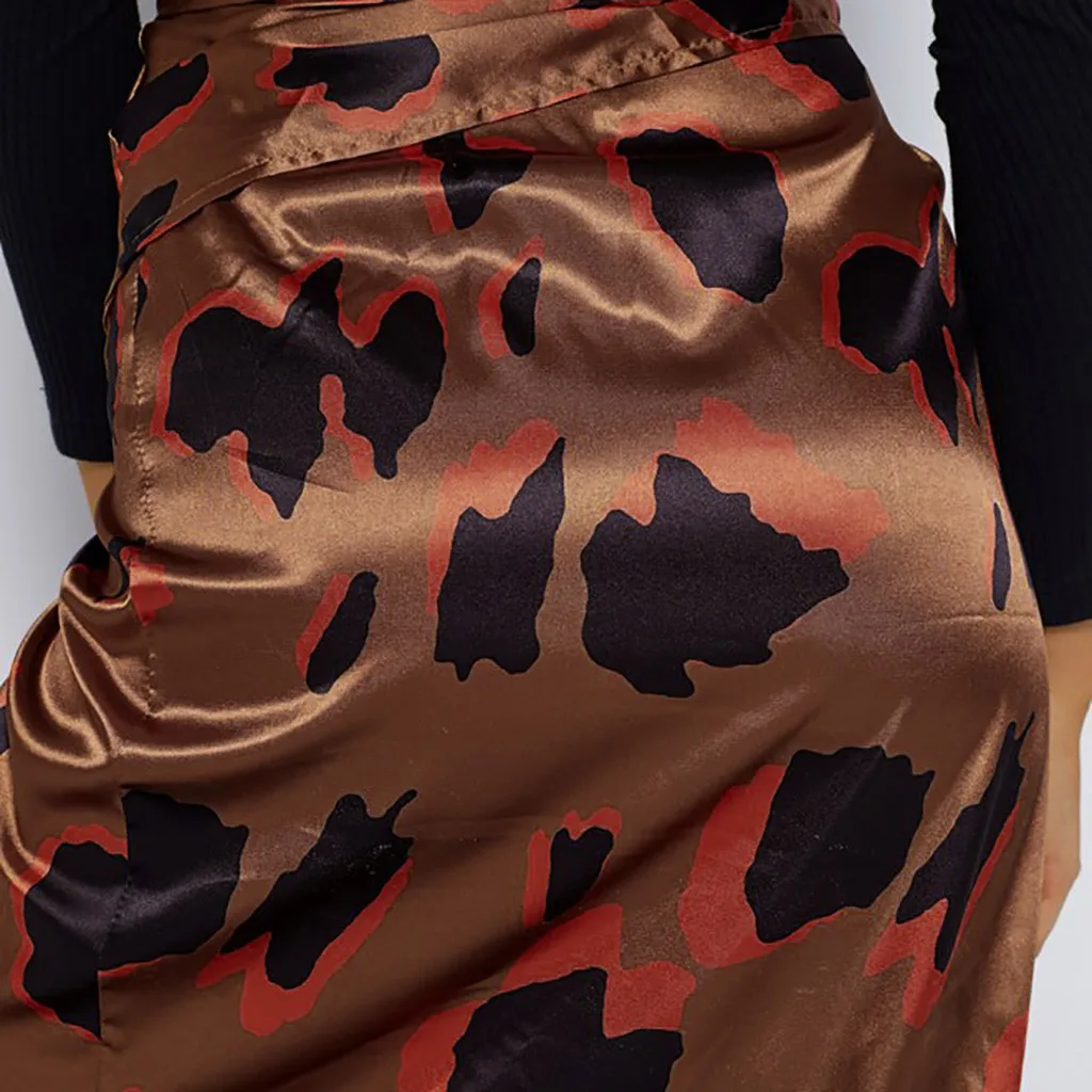 Женская атласная юбка средней длины, с разрезом сбоку, с завышенной талией и леопардовым принтом