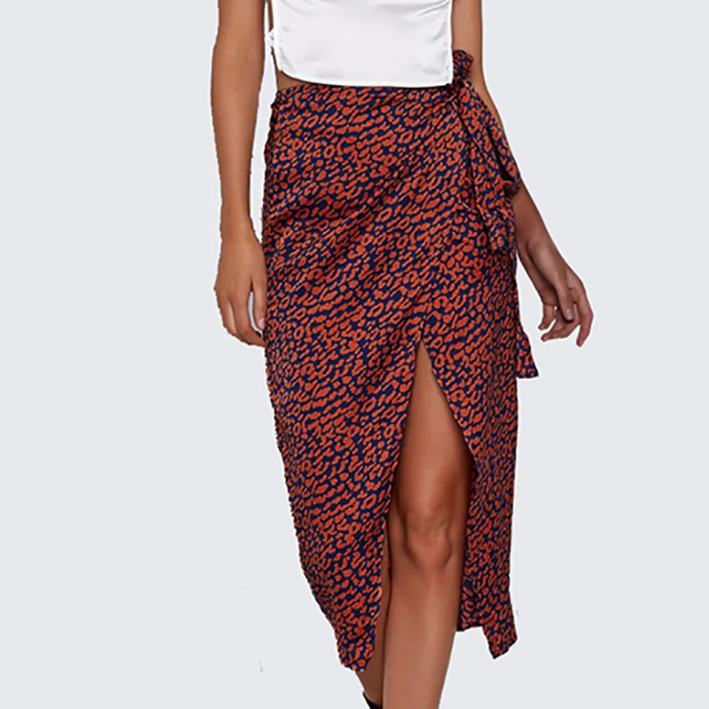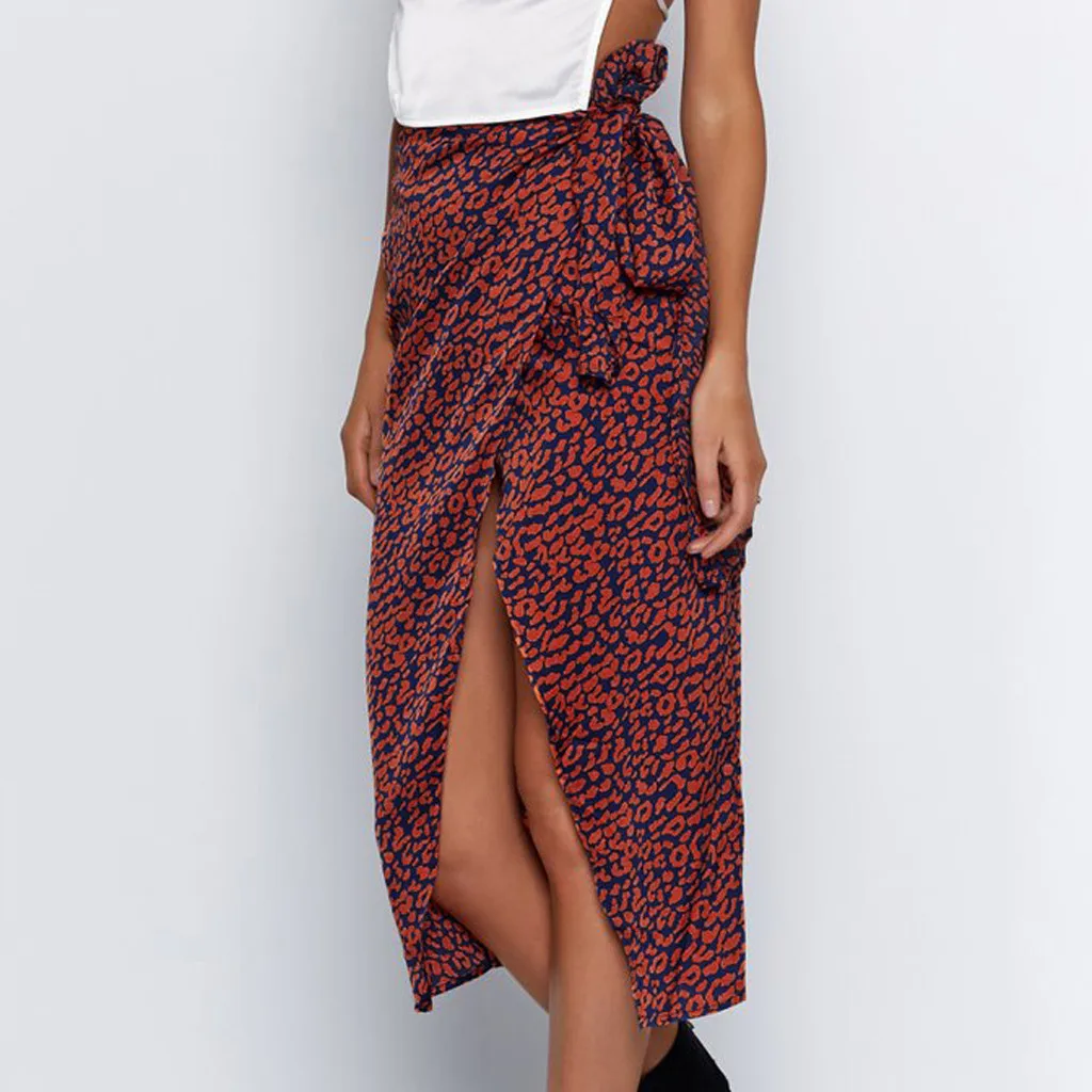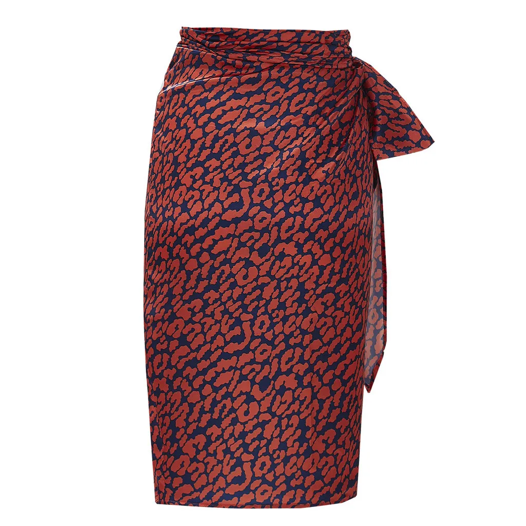 Женская атласная юбка средней длины, с разрезом сбоку, с завышенной талией и леопардовым принтом