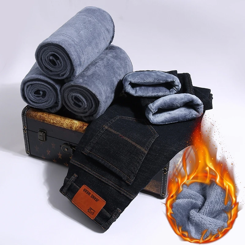 Новые модные брендовые мужские зимние толстые теплые флисовые джинсы мужские сохраняющие тепло комбинезоны брюки промытая шерсть брюки