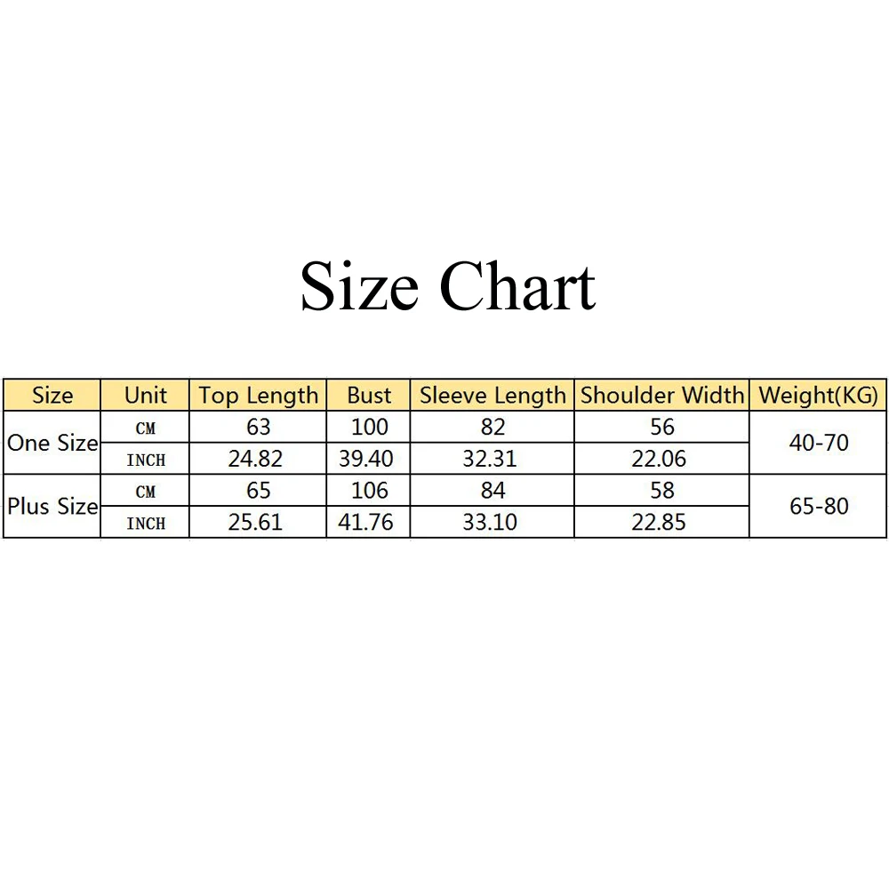 Один размер: длина верха: 63 см, обхват груди: 100 см, длина рукава: 82 см, ширина плеч: 56 см, вес: 40-70 кг.