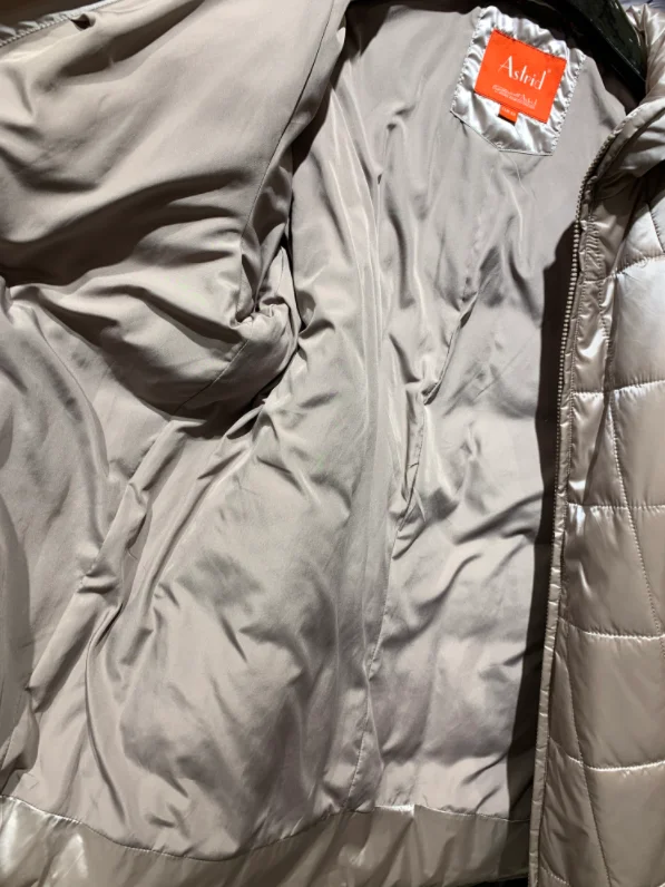 Куртка Astrid отличная!Цвет перламутровый503graypurple,за 3.404,35р-7xl.Мои размеры:158см рост;121см ОГ;117смОТ;132смОБ,руки полные.Не обтягивает, а свободно, что я могу надеть спокойно куртку на тонкую футболку и на средней толщины трикотажную кофту.На самой куртке ярлык 56 европейский размер.Капюшон слитный,не отстёгивается.ЗамОк с одним бегунком.На рукавах внизу трикотажные манжеты,их можно подвернуть-загнуть.До Томска на почту доставка за 21 день.Я довольная! Рекомендую!!!