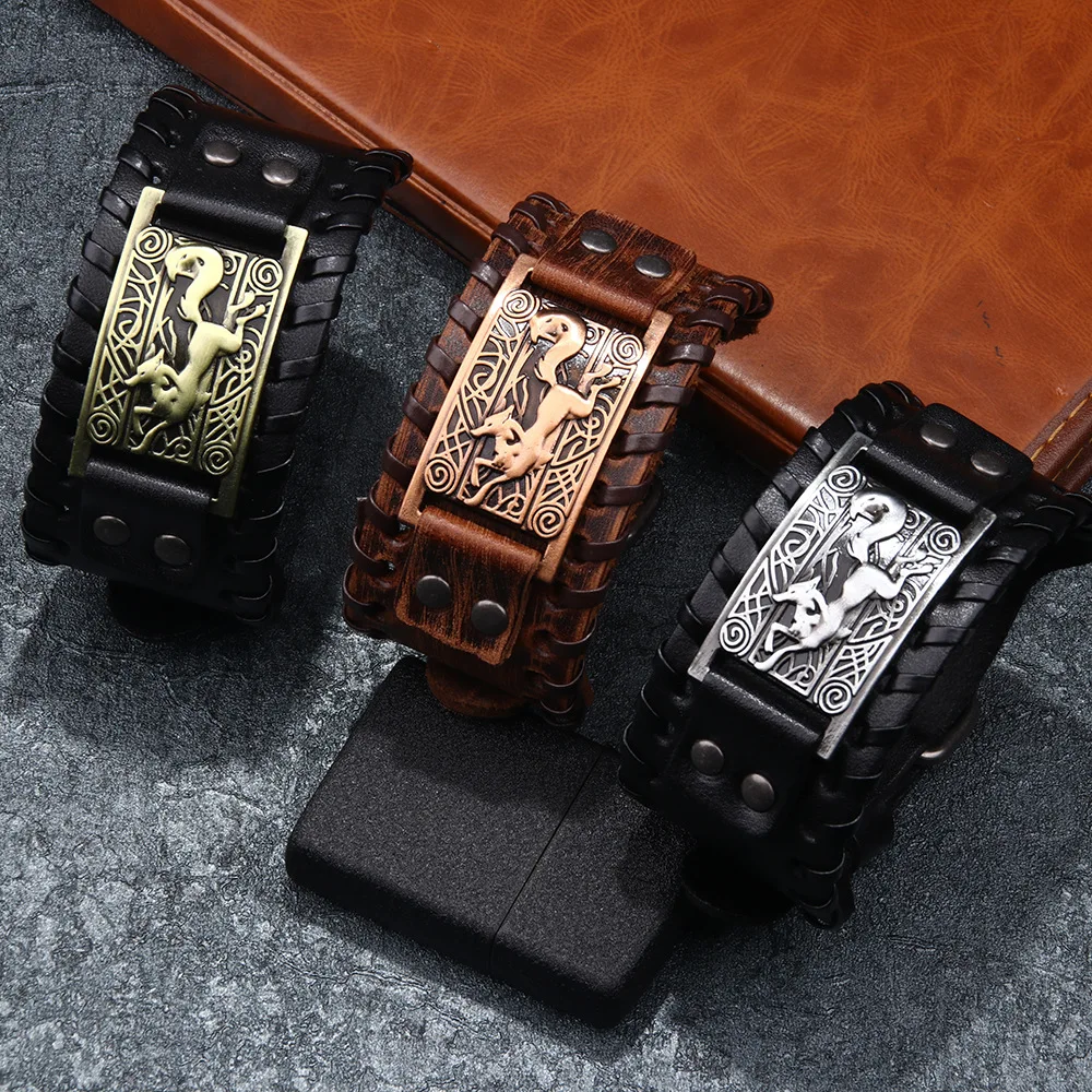 Плетеный браслет из шнура и сплава в стиле панк, регулируемый браслет из натуральной кожи, мужские кожаные браслеты тотемного Викинга, широкий браслет на запястье