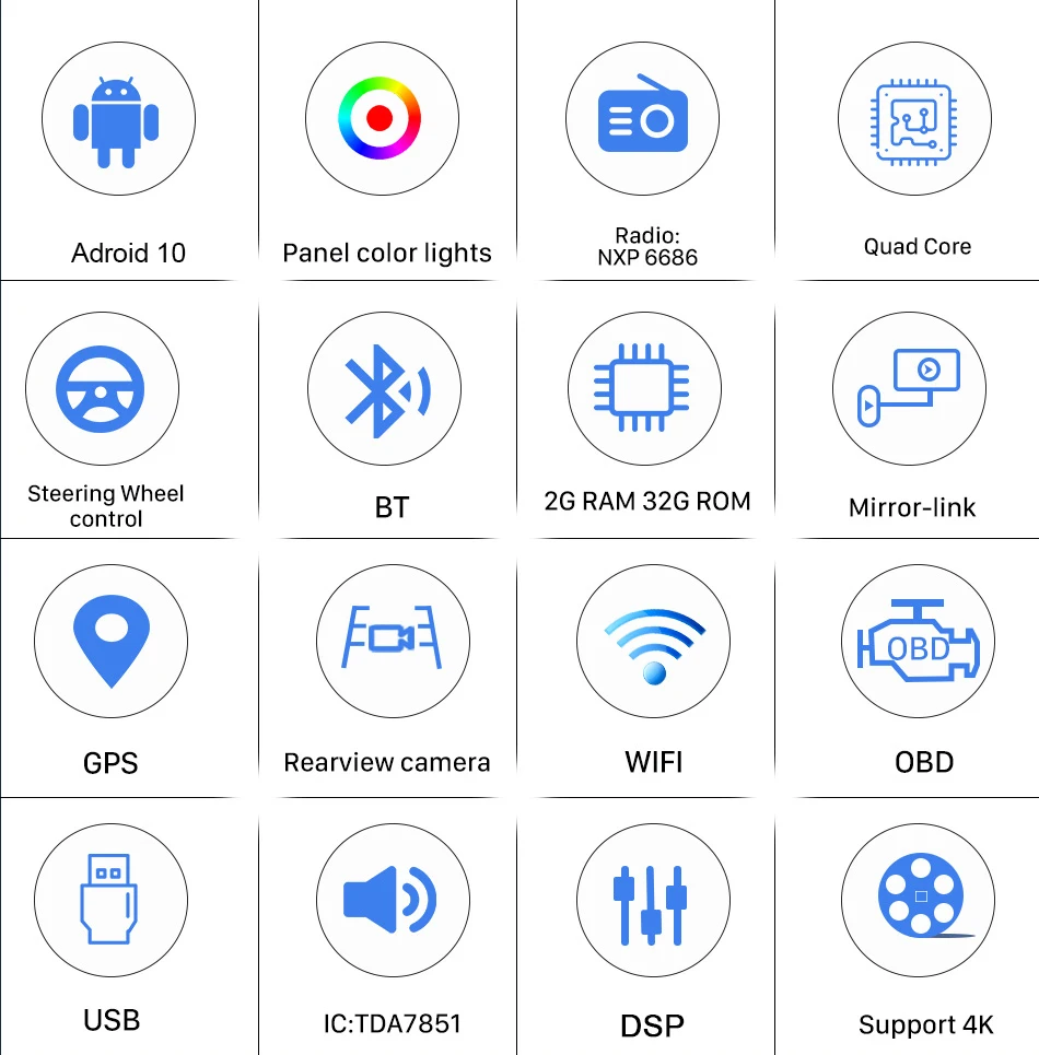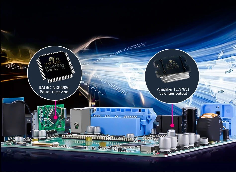 Высококлассный чипБолее быстрая работа, более высокая эффективностьЛучший прием радио и звукПроцессор усилителя: ST7851, выход: 4*48 ВтРадиопроцессор: TDA6686