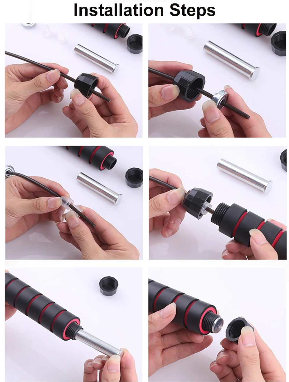 Материал: пластик + подшипник + стальная проволока + ПВХ Цвет: черный/красный/зеленый/синий Вес: 160 г Подходящая сцена: фитнес-оборудование, фитнес-боди Использование: похудение, фитнес, развлекательные тренировки Размер: длина ручки 16 см, длина троса 3 см, диаметр веревки 4 мм (длина веревки может регулироваться в соответствии с высотой).