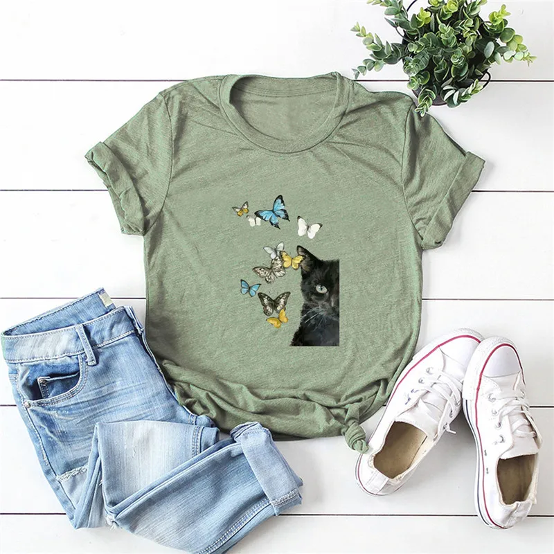 Милая летняя футболка с принтом милого кота, женская футболка из 10...