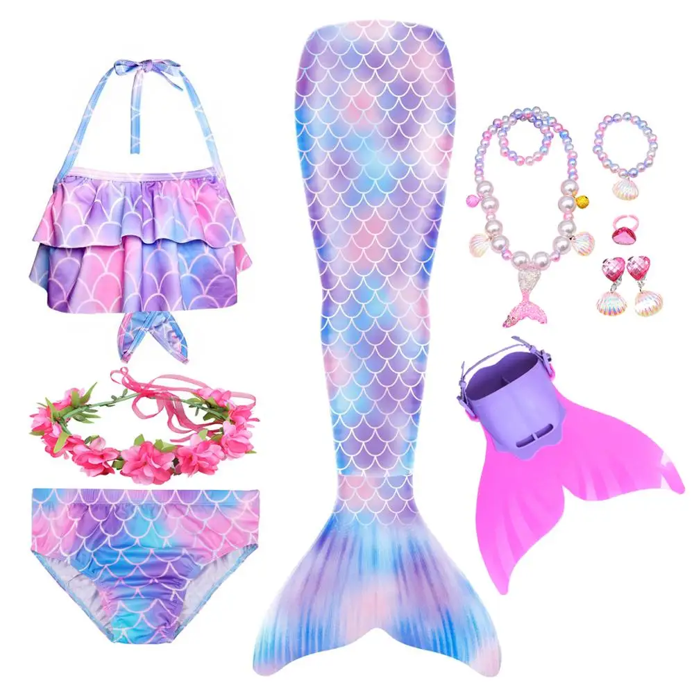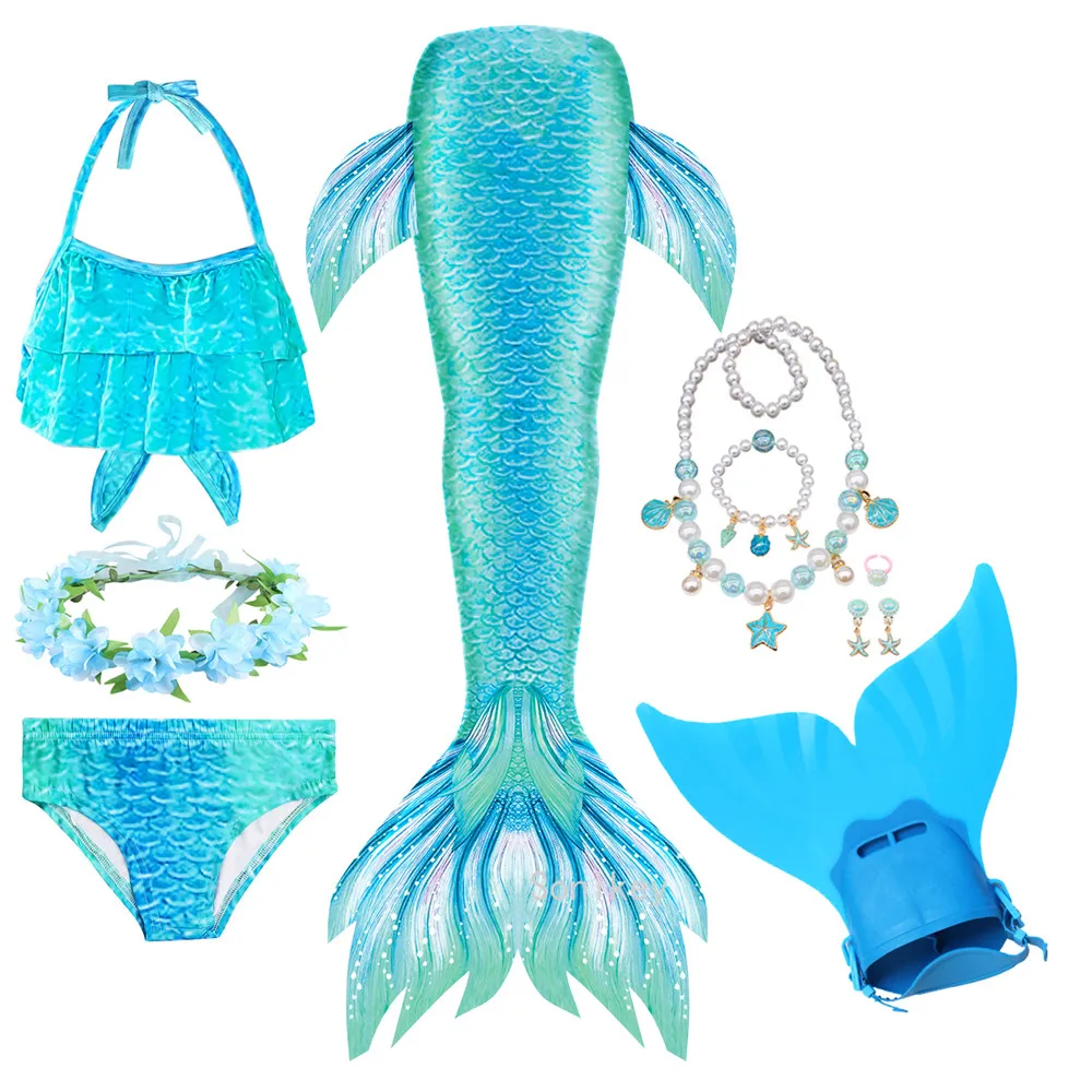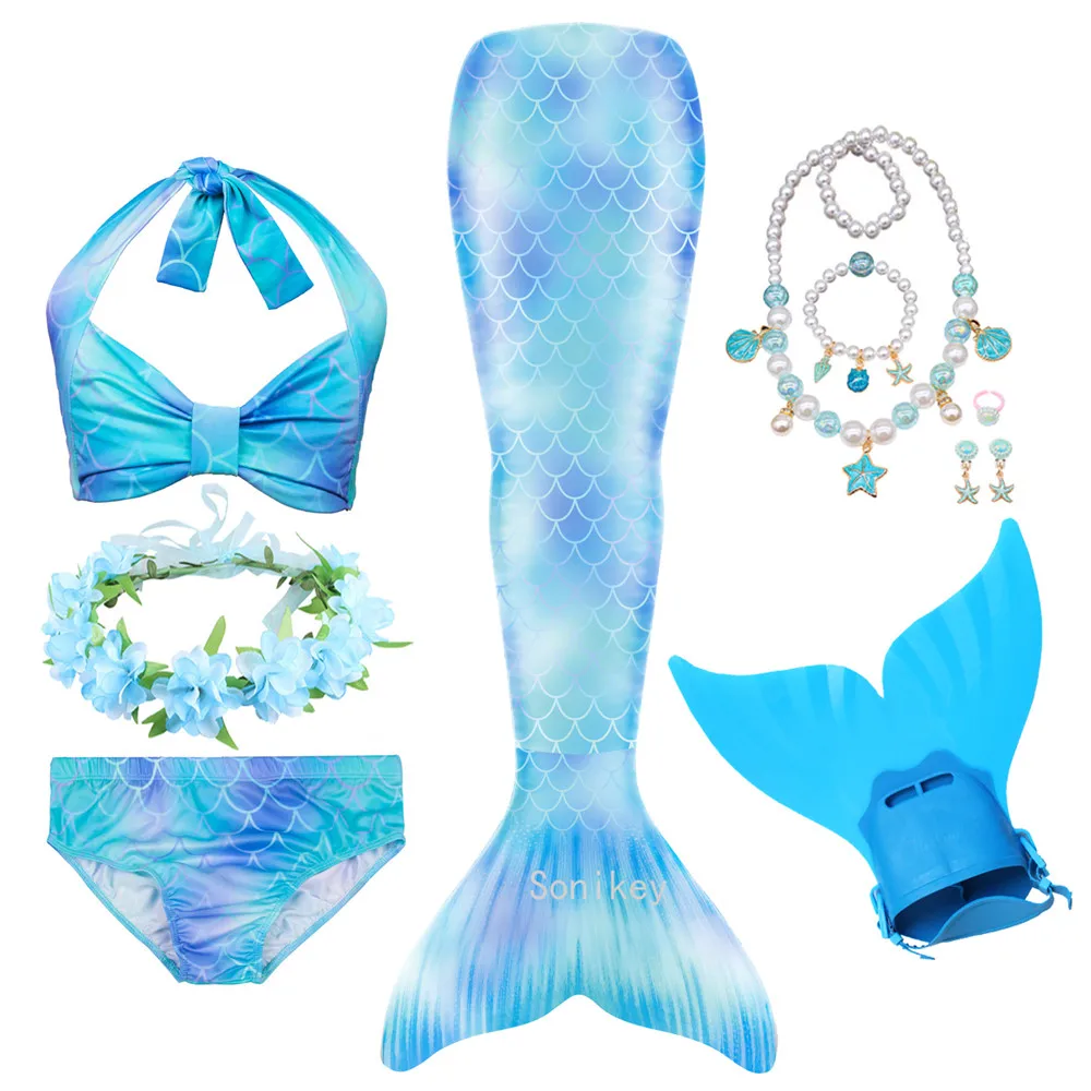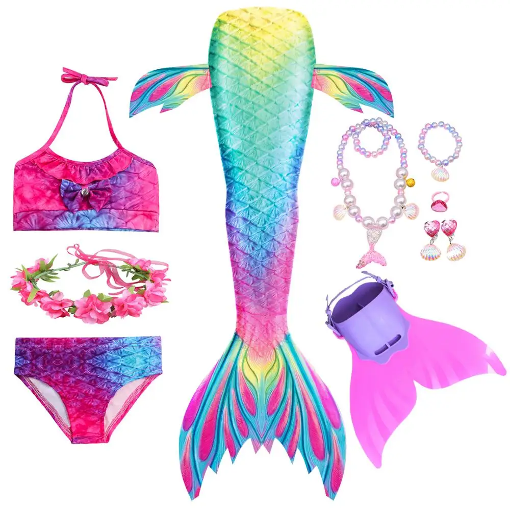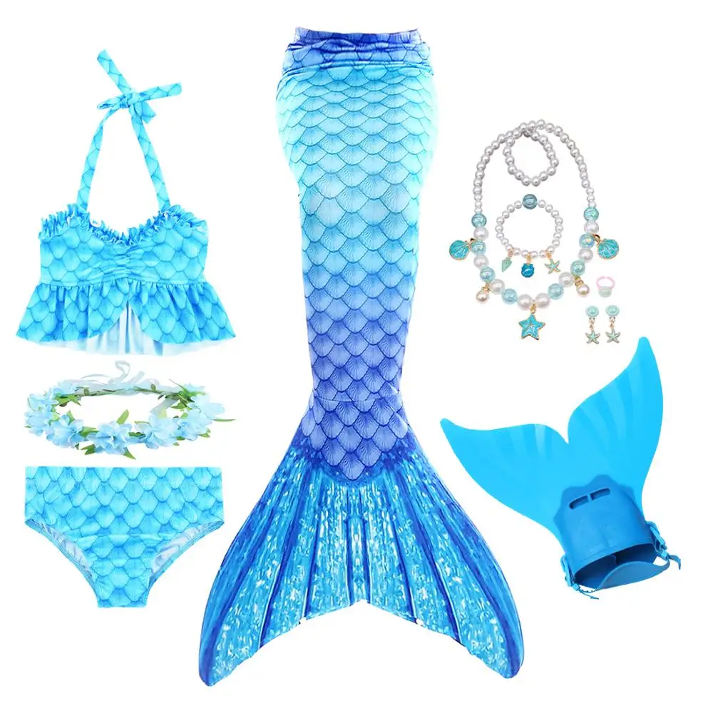 Список посылка10 шт.:1 * платье с хвостом русалки + 1 * бюстгальтер + 1 * шорты + 1 * гирлянда + 1 * монофин + 1 * комплект с ожерельем