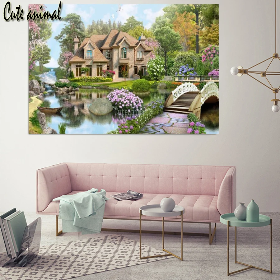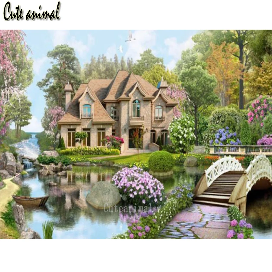 Алмазная картина, вышивка крестиком, садовая вилла, цветок, Весенняя Ландшафтная мозаика с бриллиантами, алмазная вышивка, полное качество, круглая дрель, подарок