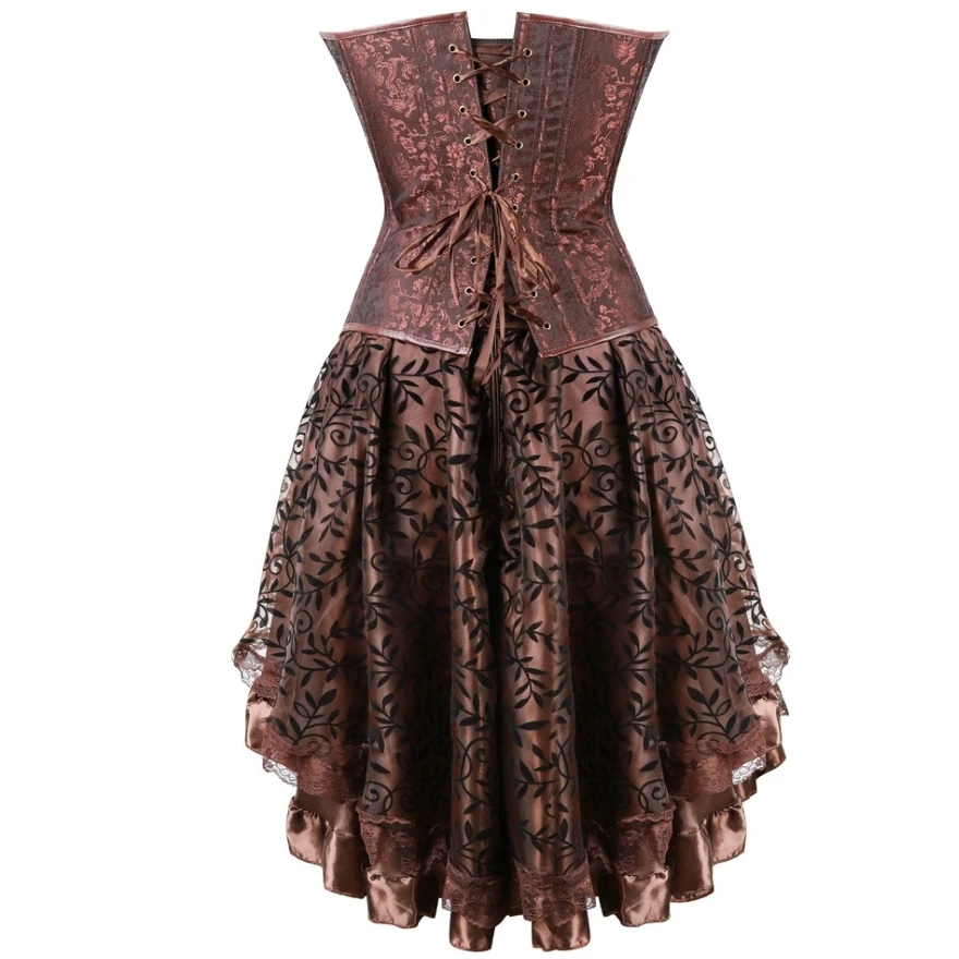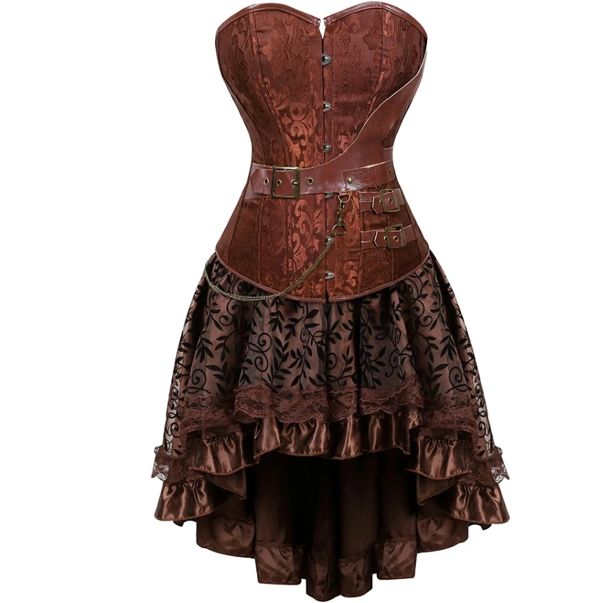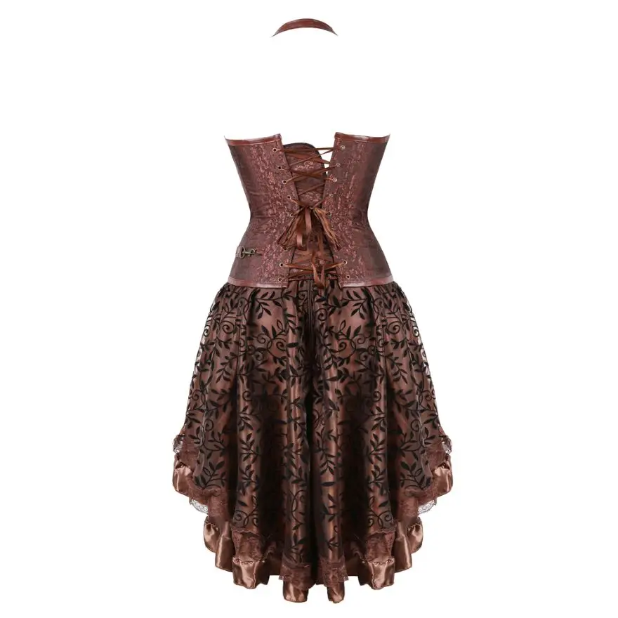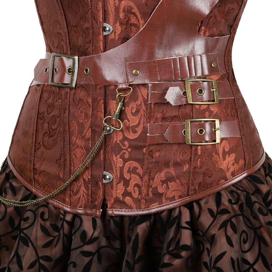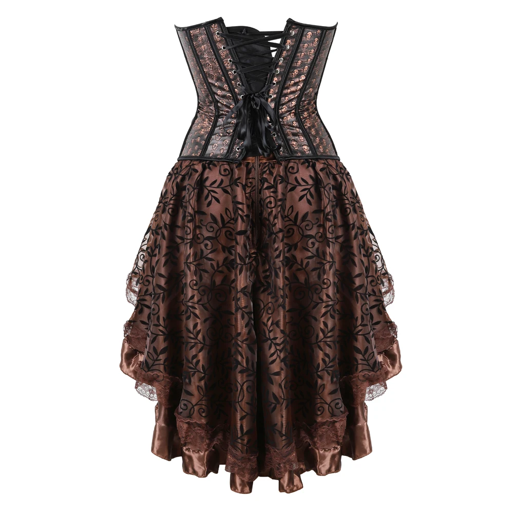 Женское готическое платье из искусственной кожи в стиле стимпанк, корсет-бюстье с комплектом корсет с цветочным принтом, пиратский костюм на Хэллоуин, коричневое, юбка в стиле бурлеск