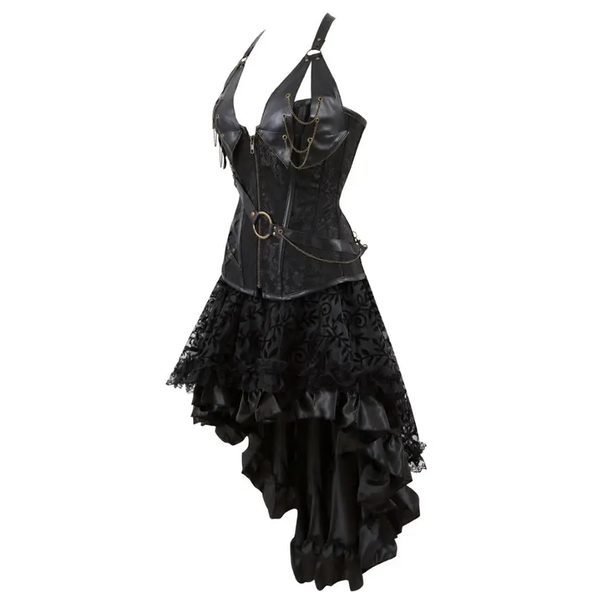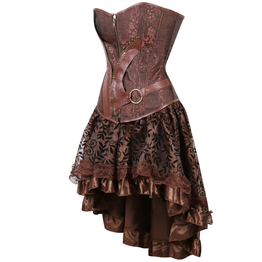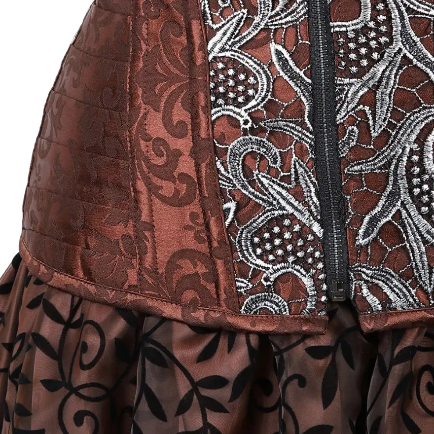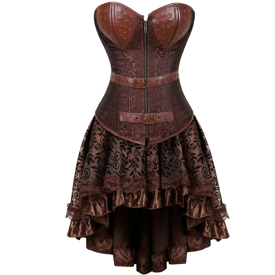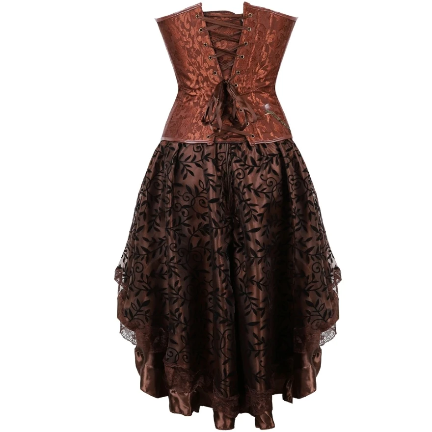 Женское готическое платье из искусственной кожи в стиле стимпанк, корсет-бюстье с комплектом корсет с цветочным принтом, пиратский костюм на Хэллоуин, коричневое, юбка в стиле бурлеск