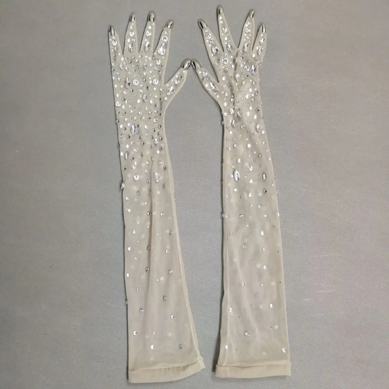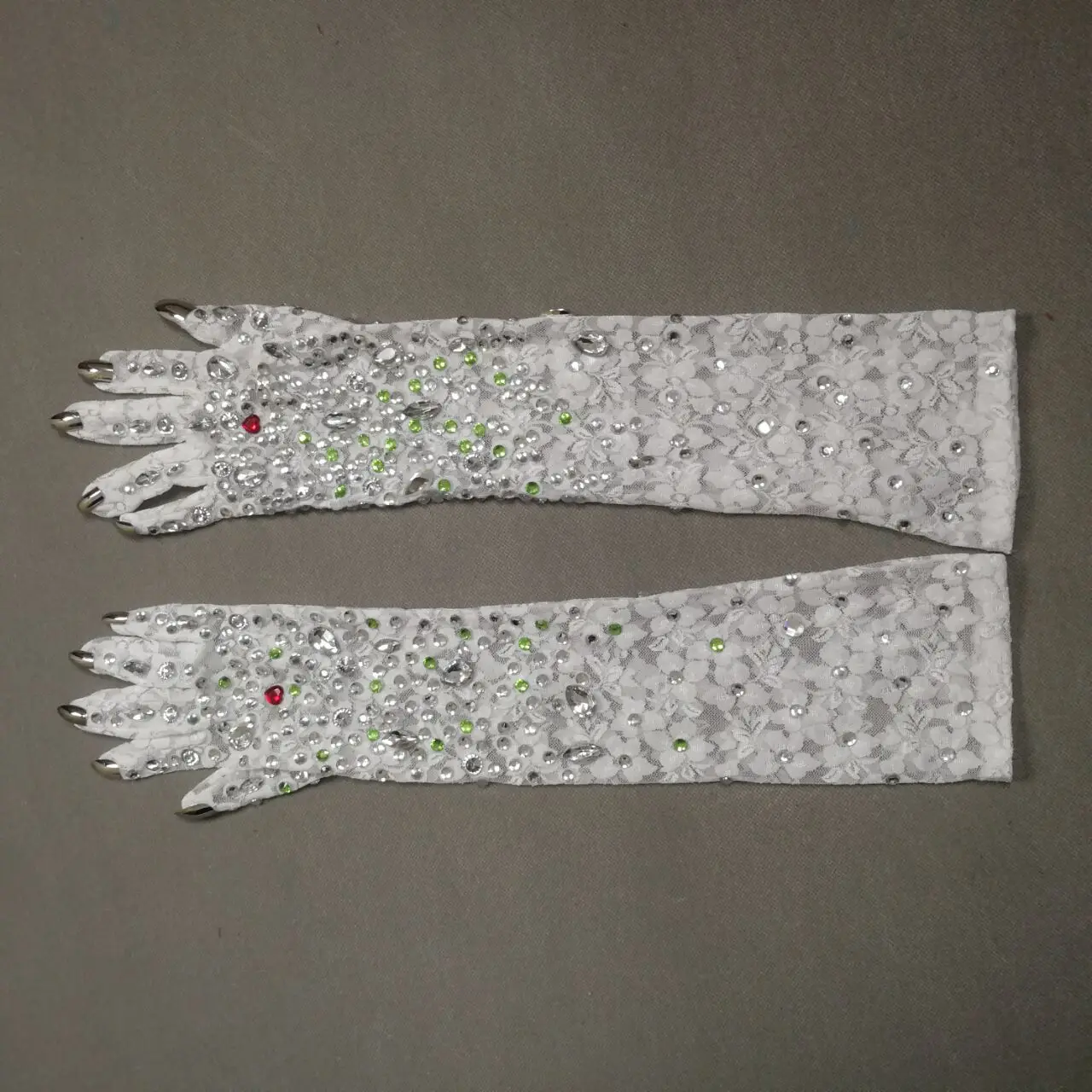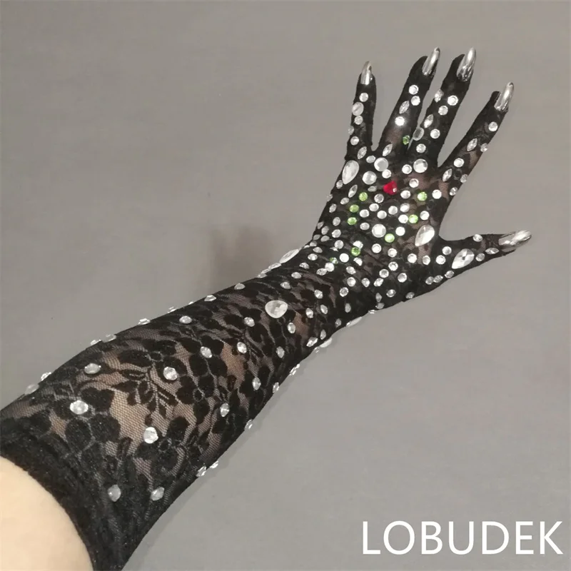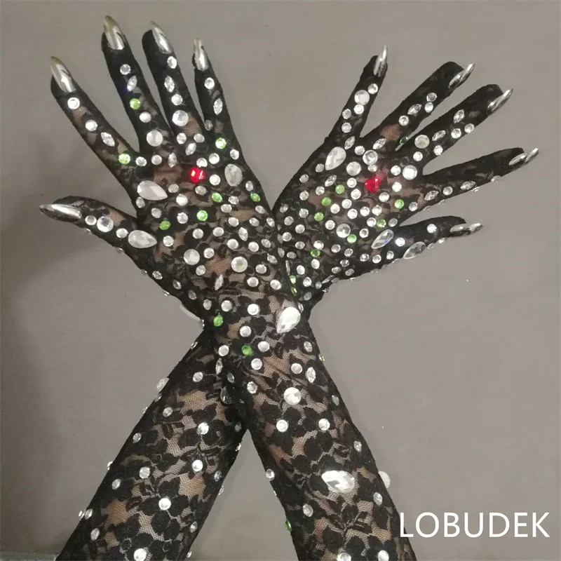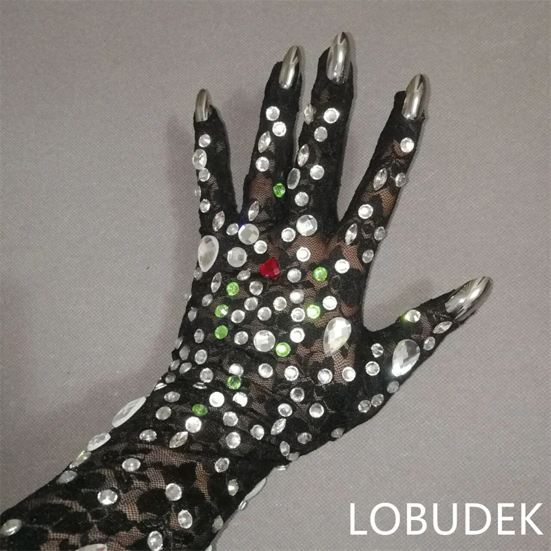 Кожа черная сетка стрейч перчатки со стразами кристаллами камнями длинные, приталенный смокинг, брендовый модный белый свадебный певица шоу сцена аксессуары