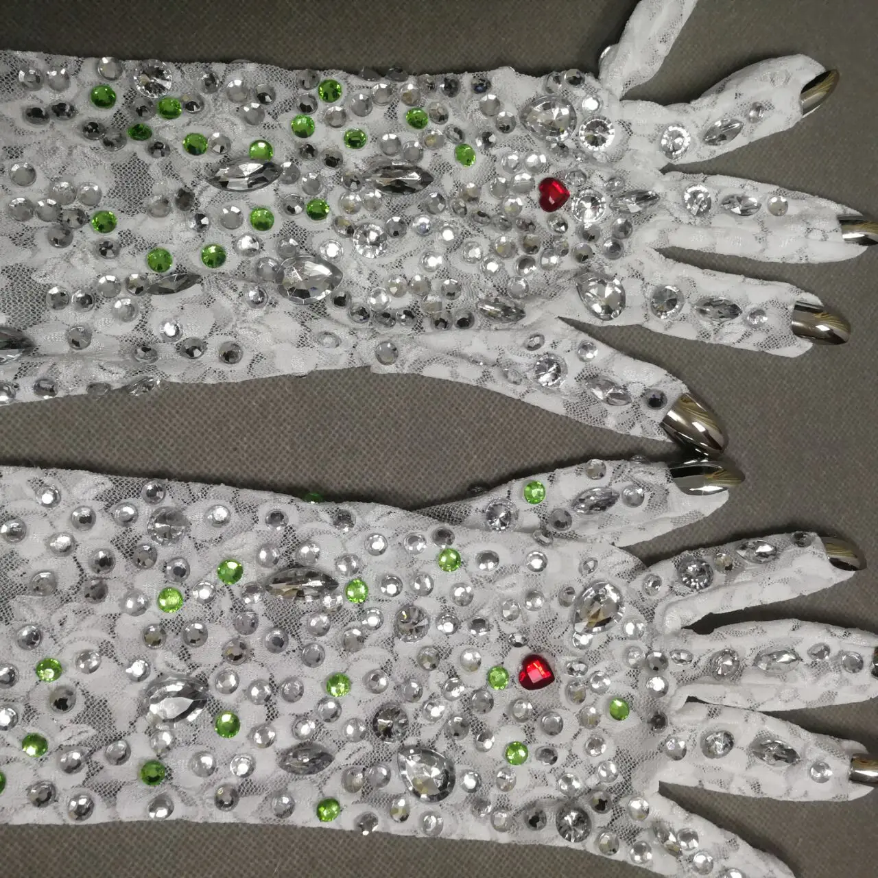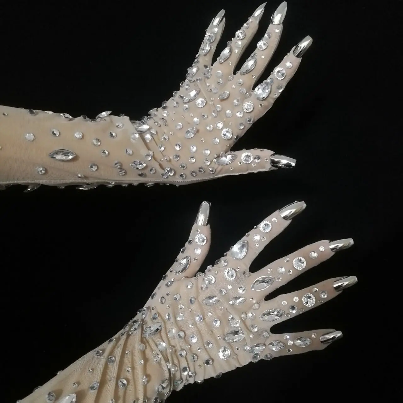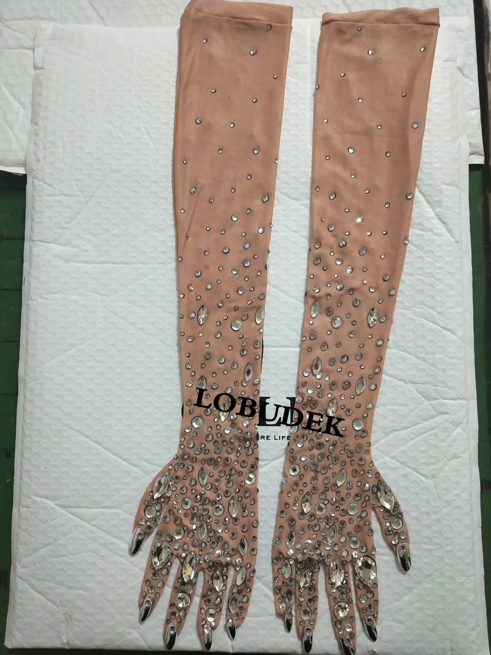 Кожа черная сетка стрейч перчатки со стразами кристаллами камнями длинные, приталенный смокинг, брендовый модный белый свадебный певица шоу сцена аксессуары